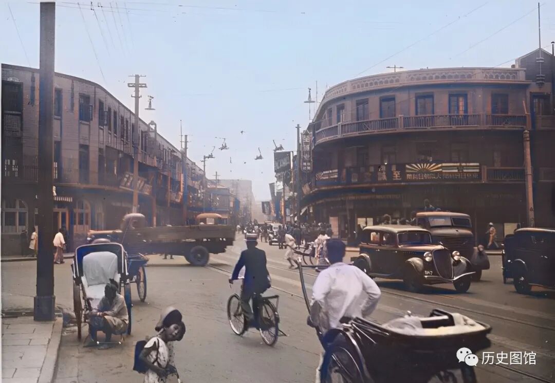 这是1938年的上海吴淞路口。街道笔直,一眼望不到边。街道上汽车来往穿梭。有黄包车师傅坐在路口等待载客。日本侵占虹口后,吴淞路就成为了一条日本商业街。街边店铺的门头上,还能看到日本元素。
