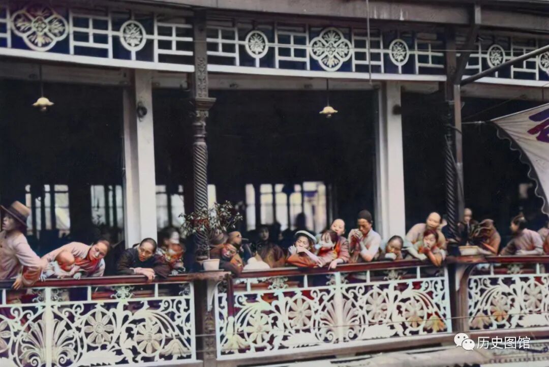 这是位于四马路的青莲阁茶楼,是沪上闻名遐迩的老字号茶楼,曾被列为“上海洋场一景”。茶楼两层,上面喝茶,下面是游艺、杂耍、唱曲和摊贩于一体的小型游乐场。可能是楼下大街上发生了什么事,人们趴在栏杆上往下张望。照片拍摄于1931年。