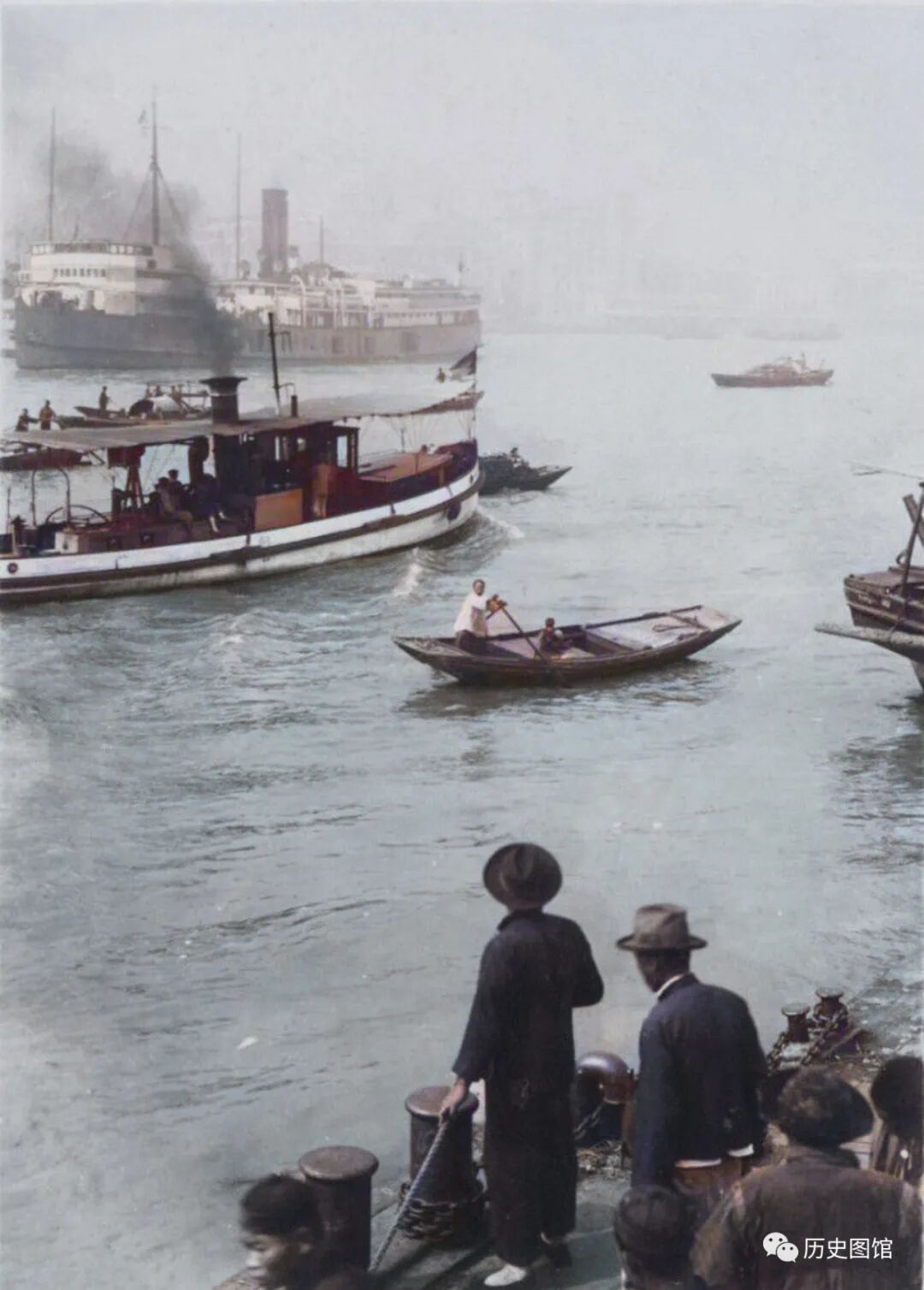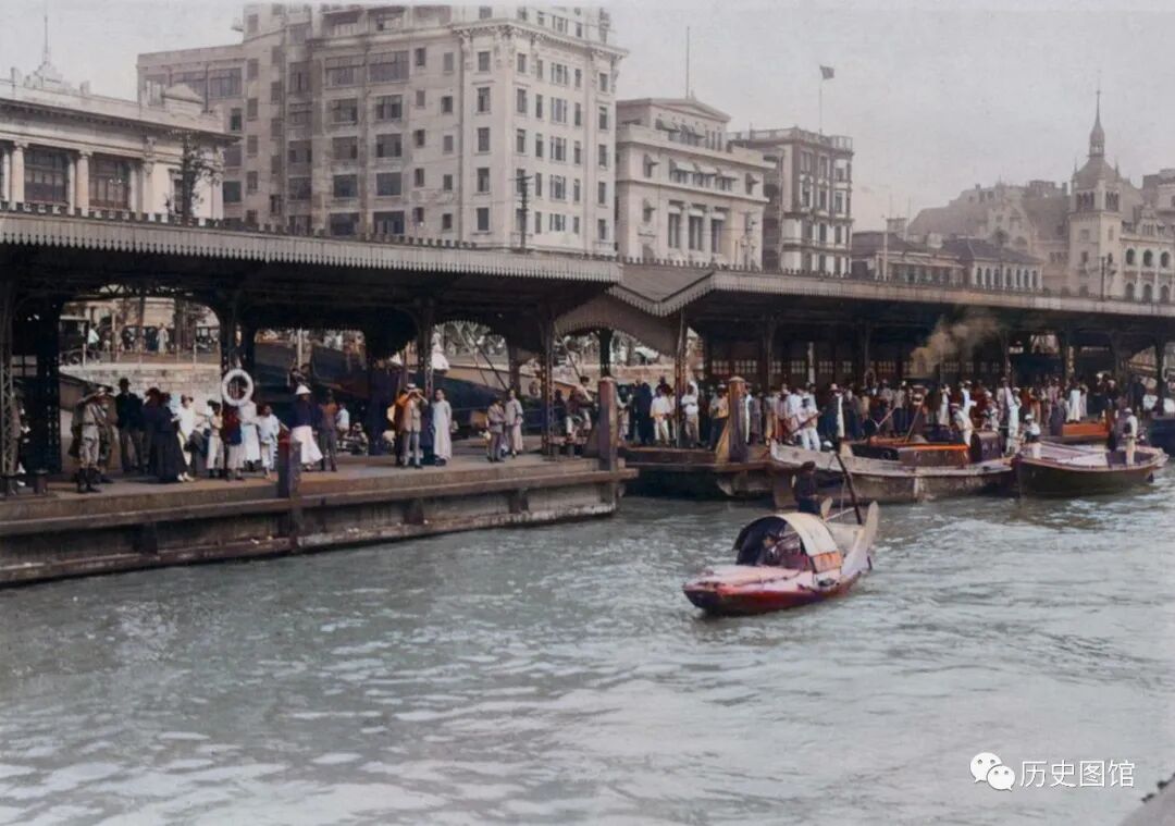 这张照片拍摄于1926年,这是上海海关大楼前的码头,人们站在栈桥上,等待登船。仔细看后面的建筑,还能看到华俄道胜银行大楼。江面上,一条条小船来往穿梭,载着乘客到达想要去的地方。