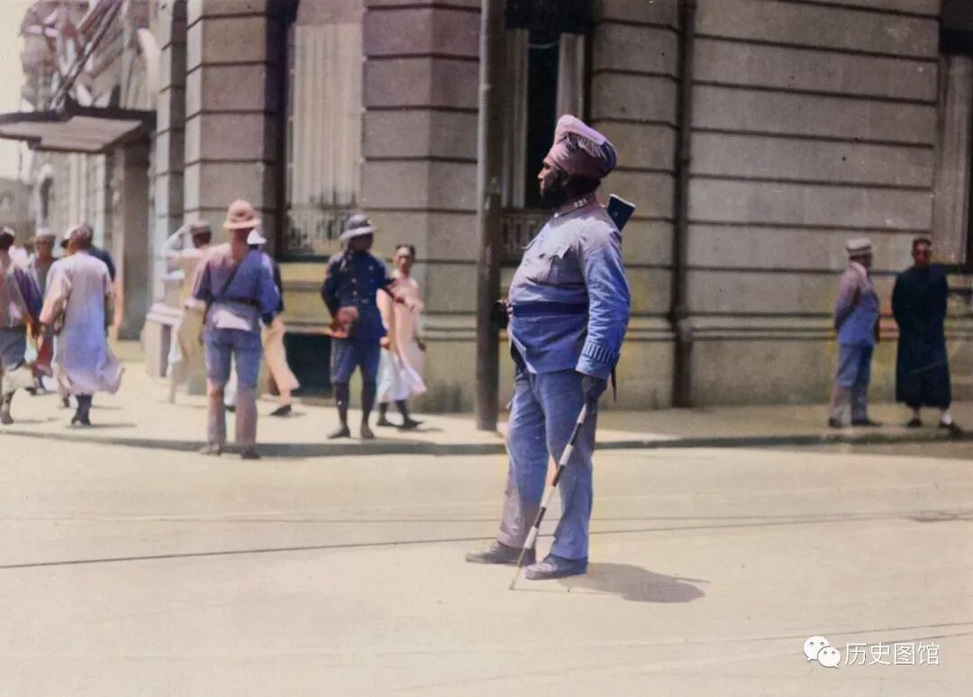这是租界内的一名外国警察,正站在街头执勤。不同国家的租界,有不同国家的警察。他们身上的穿着也各不相同。照片拍摄于1938年。