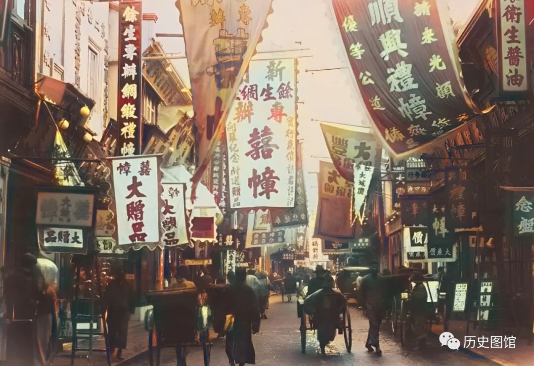 这条繁华的商业街,是上海的河南街。街道笔直,两旁店铺林立,多如牛毛的广告牌子和广告旗让人目不暇接。有黄包车从街上驶过,行人在悠闲地逛街。
