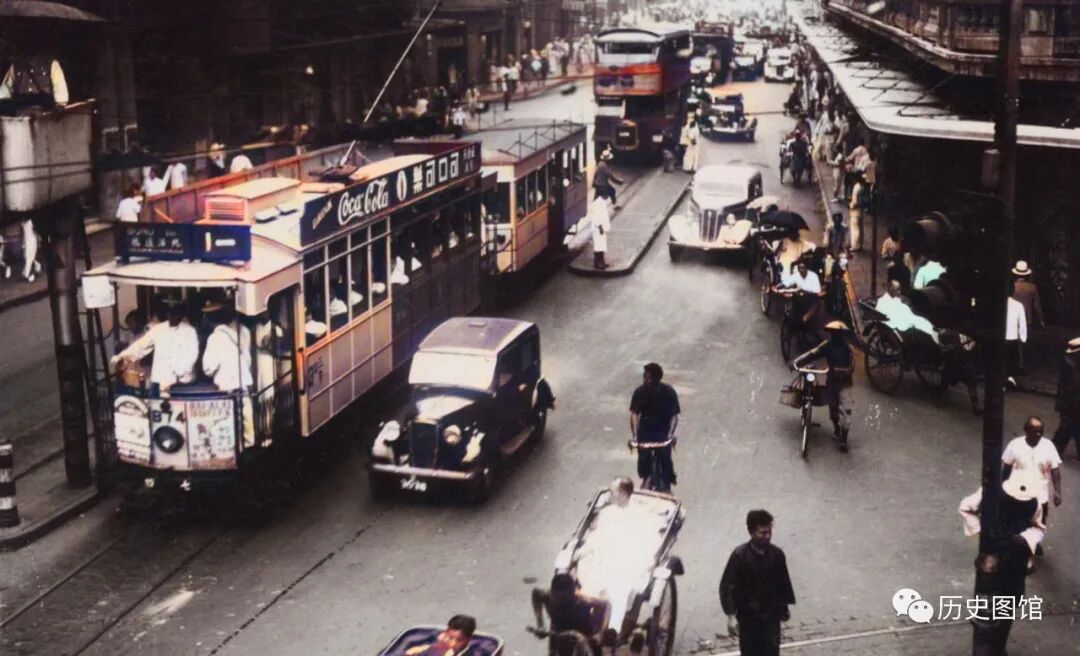 繁华的南京路上,有轨电车正在路边等待乘客上车。马路中间,汽车来往穿梭。还有拉黄包车的、骑自行车的。街道十分宽阔,两侧店铺林立。老上海南京路上的四大百货公司,创亚洲百货业无数先河。