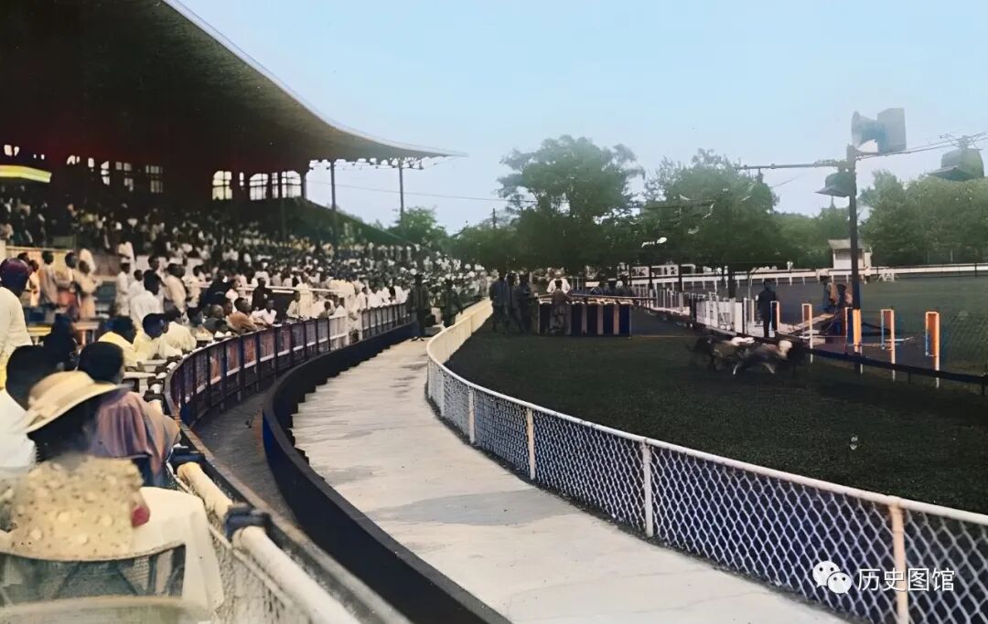 十里洋场,娱乐项目很多。除了赛马场,还有赛犬场。这座赛犬场,规模不小,赛道也很专业,看台上坐满了观众。照片拍摄于1938年。
