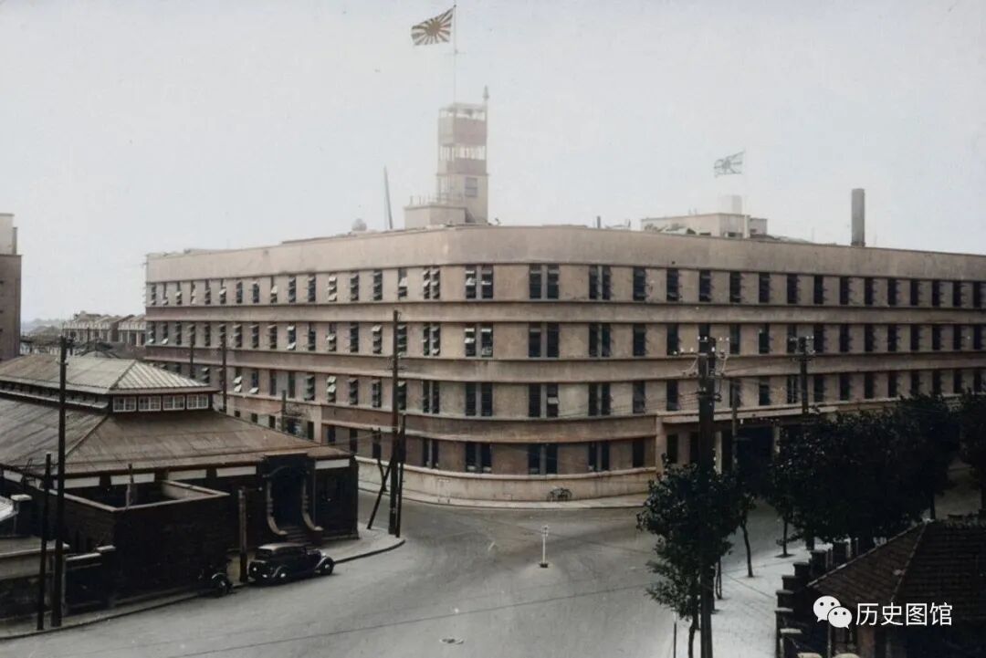 这栋四层大楼,位于北四川路(武进路以北)的一处转角处。这是日军海军陆战队在上海的驻地。大楼的外形像一艘军舰,楼顶上挂着日本军旗。这张照片拍摄于1938年。