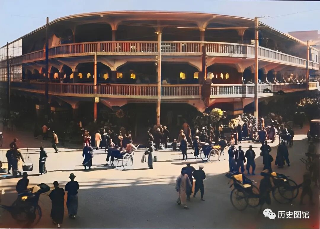 这是位于上海虹口的食品厂,始建于1890年。这是一座大型的三层建筑,内部商铺林立。很多商贩到这里进货,其中有中国人,也有外国人。大街上,有一些等待拉客的黄包车,还有身穿制服的警察也在维持秩序。照片拍摄于1931年。