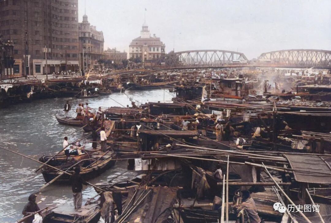 这是上海的苏州河畔,河面上停泊着很多船。远处的白渡桥清晰可见,白渡桥是旧上海的标志性建筑。是中国的第一座全钢结构铆接桥梁和仅存的不等高桁架结构桥梁。照片拍摄于1938年。