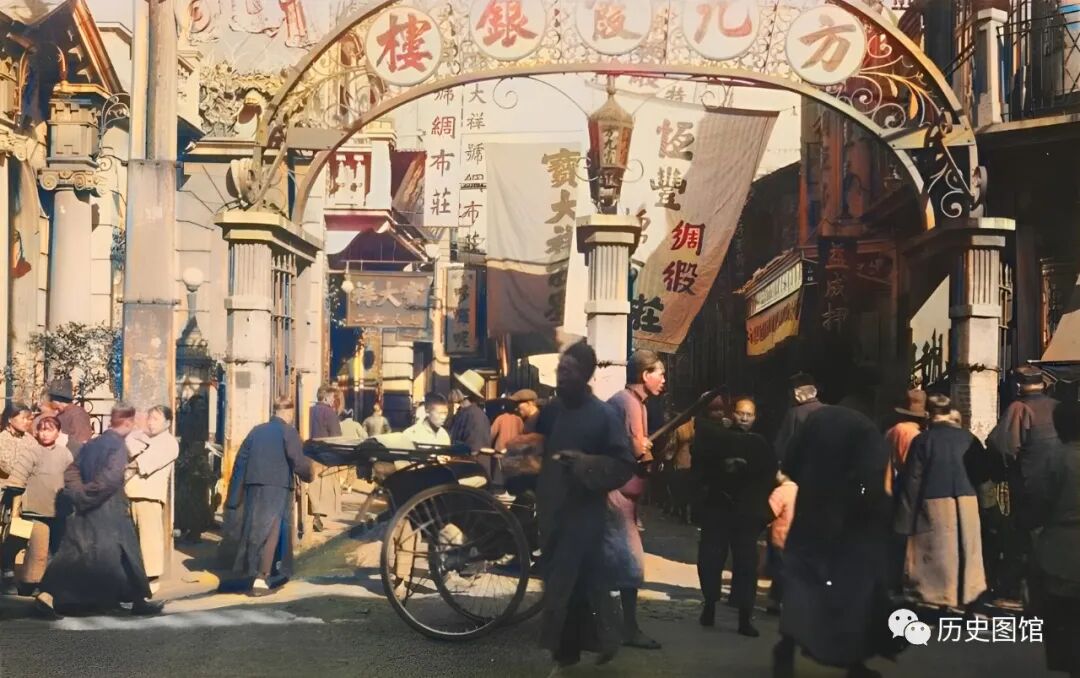 这是1931年的上海法租界,街道两旁的建筑,全都是欧式风格。法租界是旧上海最高级的住宅区。照片中,一座拱形门上方写着“方九发银楼”字样,街道里面的广告牌一个挨着一个。街道上人来人往,十分热闹。