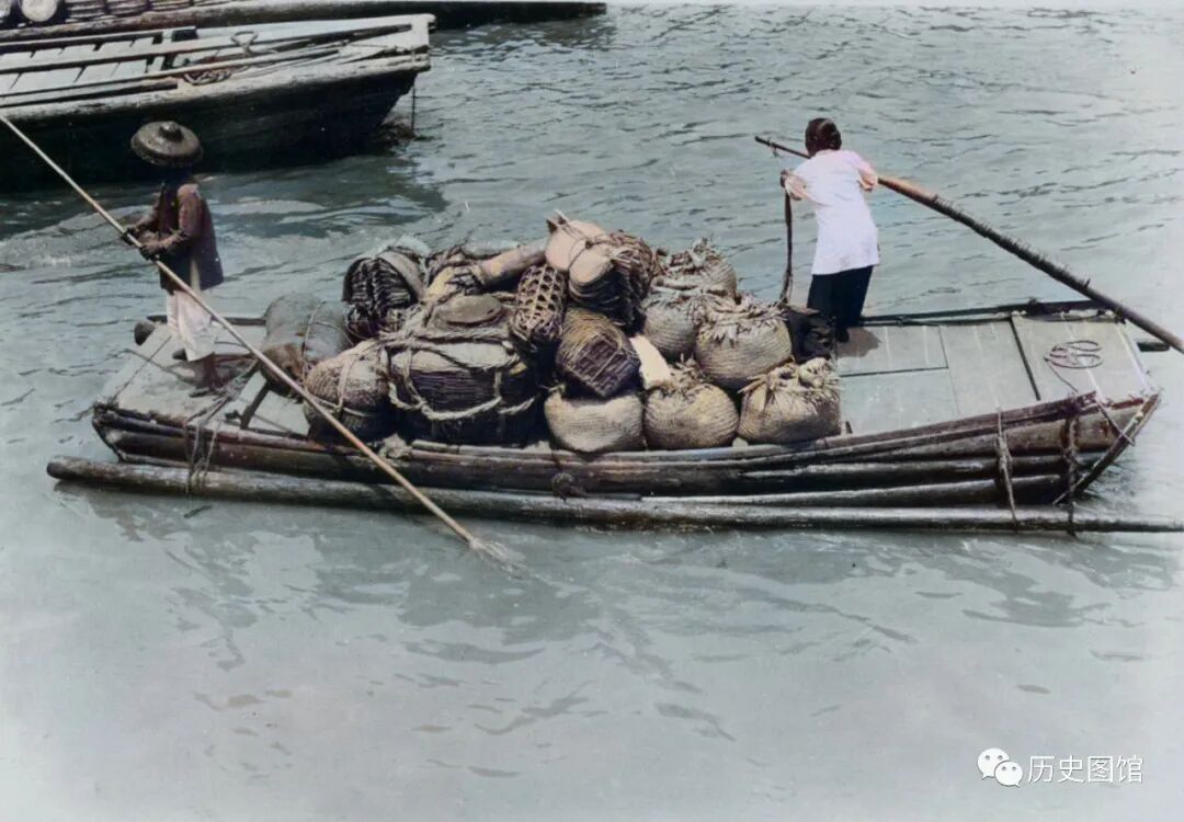 江面上,两名船工正划着一艘小船,船上装满了货物。经常有一些小商贩,会划小船靠近江中的巨轮,兜售商品做生意。这张照片拍摄于1926年。