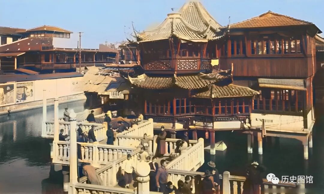 这是上海城隍庙内的湖心亭。亭子建在湖水中央,雕梁画栋。一座九曲桥连接亭子和岸边。一些有人正在桥上低头看水中的鱼儿。照片拍摄于1931年。