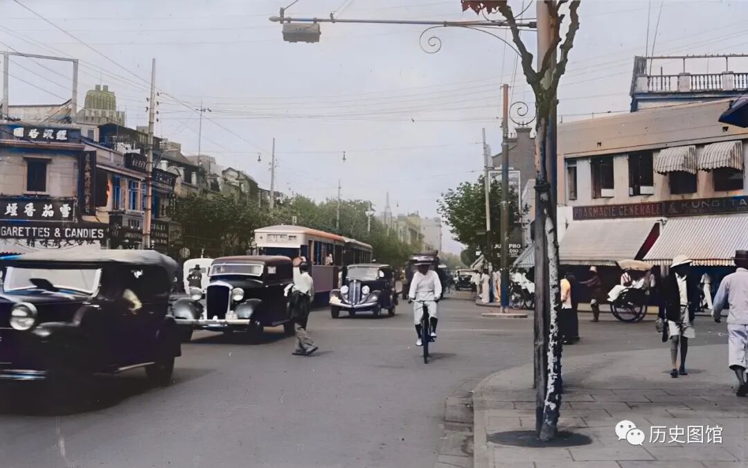 这是当时的法租界,照片拍摄于1938年。街道两侧的房建筑,具有欧式风格。街道上有汽车驶过,还能看到古老的有轨电车。