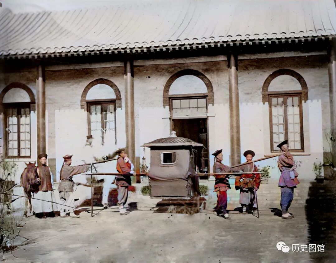 北京城内,一名官员准备出行的瞬间,几名轿班人员正抬着轿子在门前等候。有四名轿夫抬轿,可以肯定,这是一名四到六品官员,乘四人抬的蓝呢轿。照片拍摄于1885年。