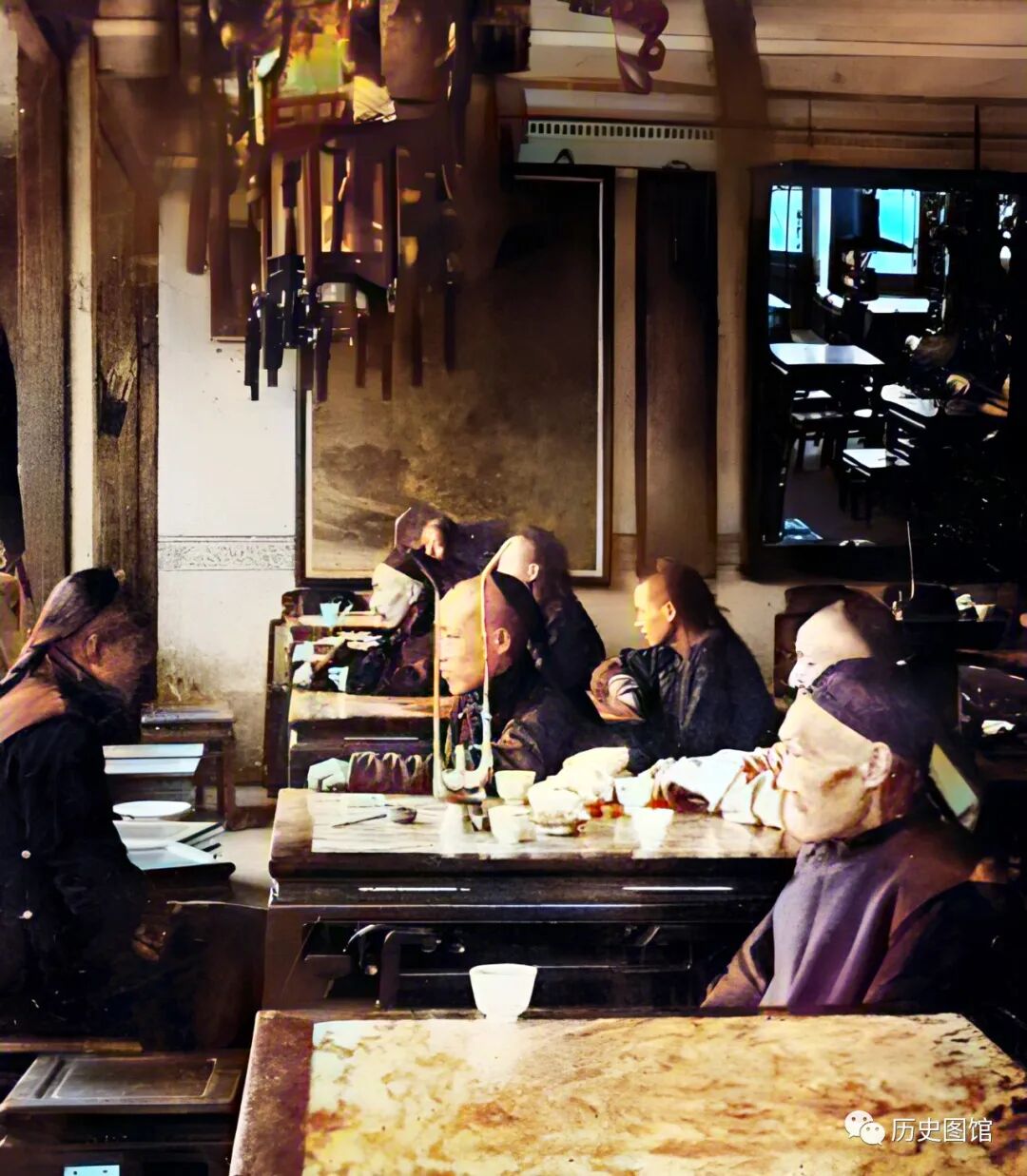 清朝末年,在北京一间茶馆里,人们正坐在桌前,一边欣赏评说艺人的表演,一边品茗,桌上摆着瓜子和糖果,好不惬意。清朝茶馆娱乐性极强,茶馆和戏园子也体现了北京人精致的生活。