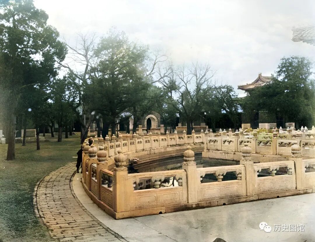 这张照片拍摄于1876年的雍和宫一角。这里环境优美,几栋高大壮观的建筑,掩映在绿树从中。一条人工河蜿蜒曲折,河道两侧修建有汉白玉栏杆。一名男子正趴在栏杆上,欣赏水里游弋的的鱼儿。