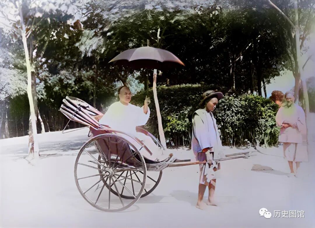 炎炎夏日,一辆黄包车上,坐着一名撑伞的男子。黄包车这种交通工具,在当时的北京街头非常普遍。人力车夫将乘客送到目的地,就能获得一定的报酬,足以养家糊口。照片拍摄于1898年。