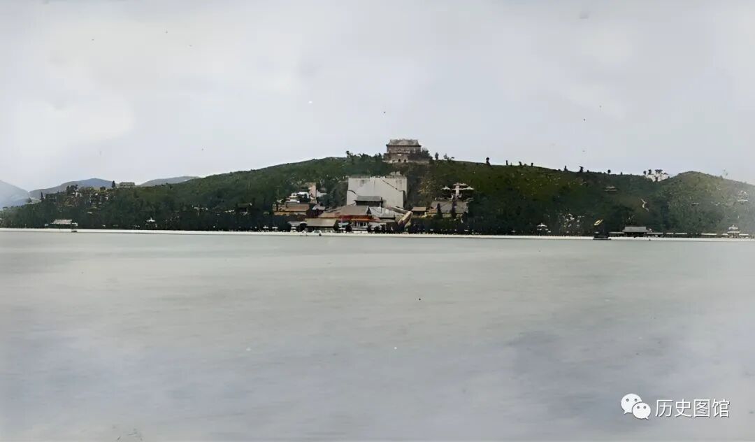这张照片,拍摄于颐和园内的万寿山,山前面那一片烟波浩渺的水域是昆明湖。古色古香的建筑群,从山脚一直延伸到山顶。一砖一瓦、一草一木,处处都透露着皇家园林的气韵。