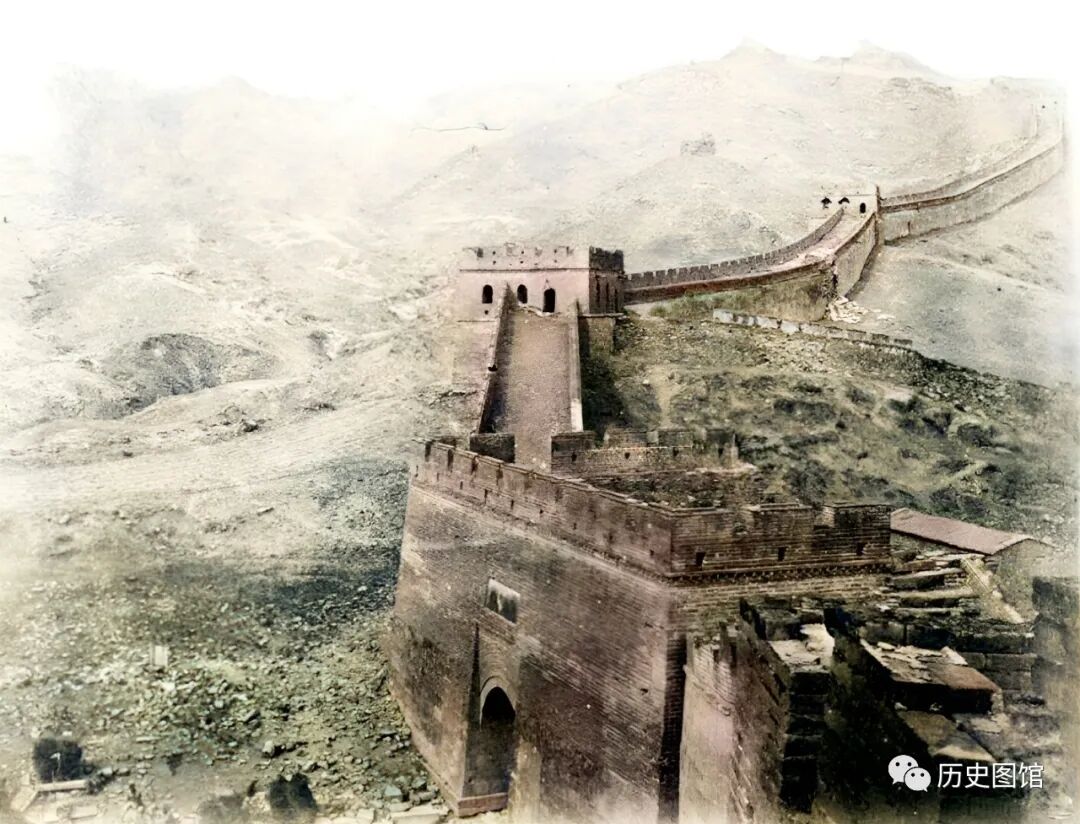 站在北京八达岭长城的烽火台上,向远处眺望。长城犹如一条巨龙,在崇山峻岭间蜿蜒盘旋。长城是中华民族的象征。照片拍摄于1877年。