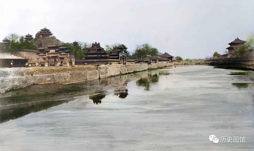 从这个角度看,就更清楚了。左边为煤山,右边就是紫禁城。煤山上的建筑临水而建,高低错落,处处彰显着皇家气派。照片拍摄于1876年(摄影:托马斯·查尔德)。