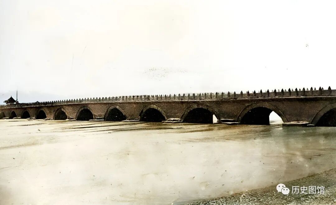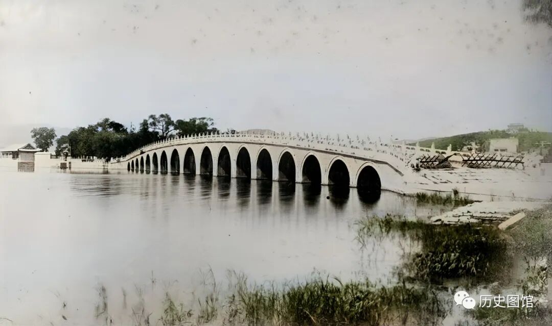 这是晚清时期的十七孔桥。该桥全长150米,有17个拱形桥孔。桥身造型优美,桥洞与水中的倒影相映成趣,是颐和园著名的景点之一。桥上雕刻有500多只石狮子,比卢沟桥的石狮子还多。