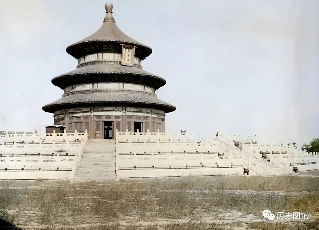 在这张照片中,祈年殿前的广场上,长满了杂草,给人以很荒凉的感觉。照片拍摄于1901年。