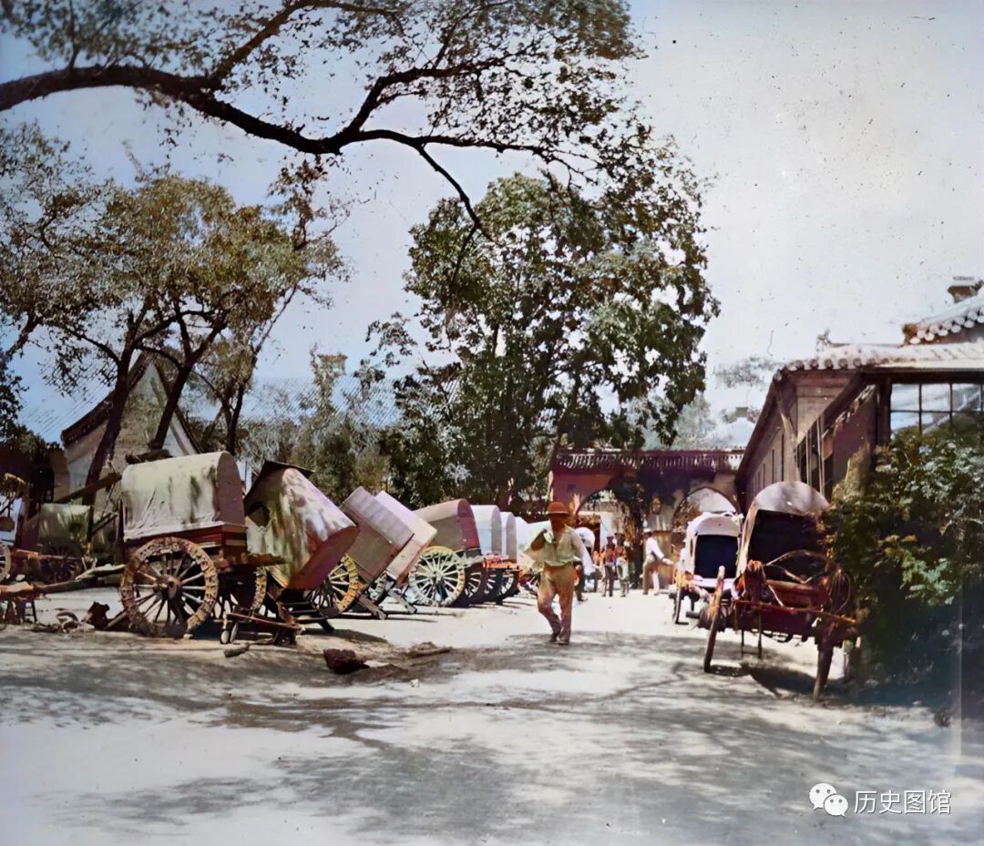 这张照片拍摄于北京当时的使馆区。一些建筑掩映在绿树丛中,在使馆区门前的广场上,停着很多载人的马车,一名外国人从马车旁边走过。
