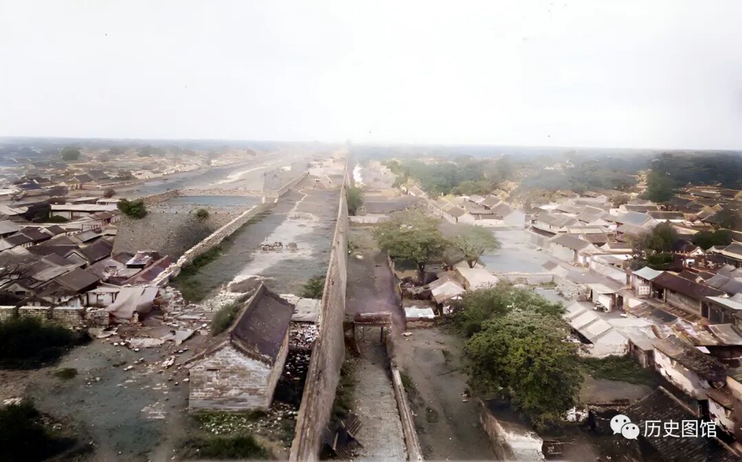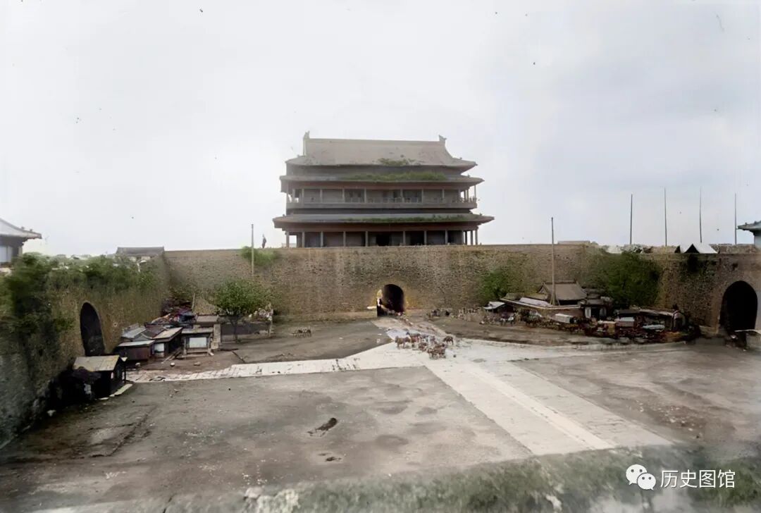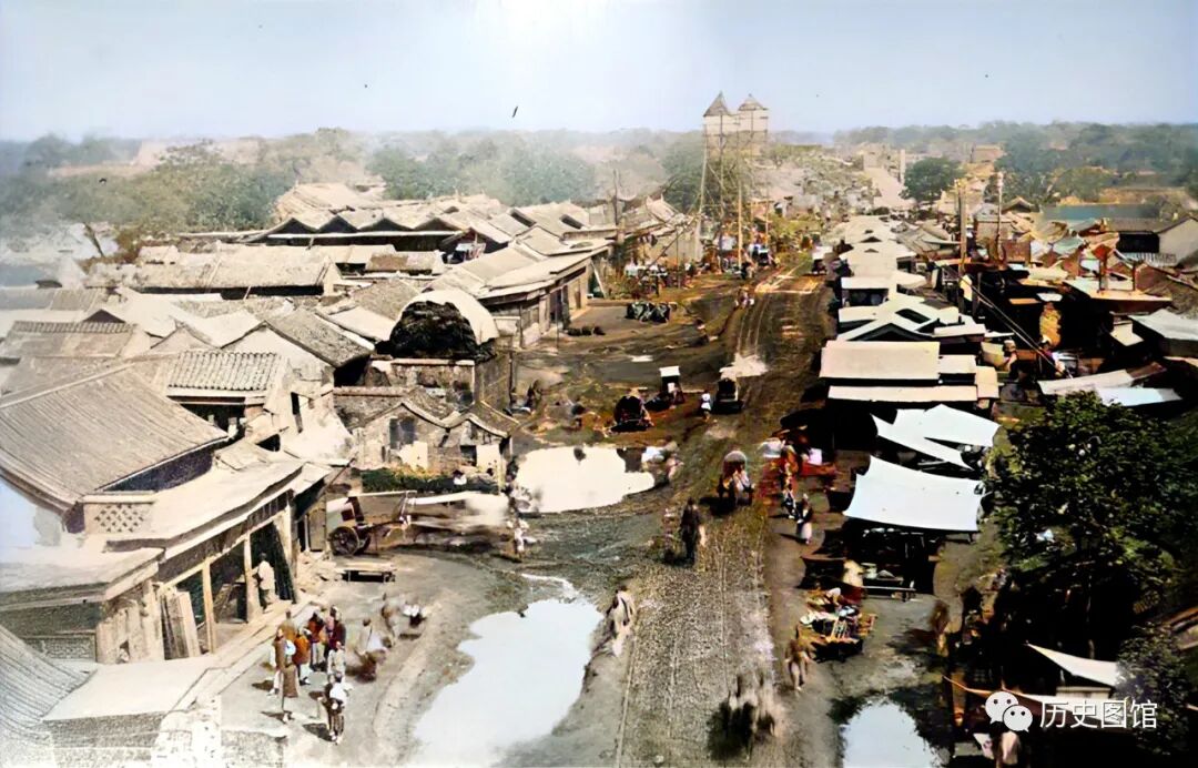 这是站在北京崇文门城楼上向北眺望,热闹的崇文门内街景象。街道两旁店铺林立。街上摆摊的都撑起了遮阳棚。