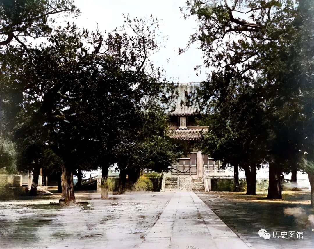 这里就是当时北京的孔子庙所在地,孔庙位于北京东城区国子监街。园内环境幽静,古柏参天。是明清时期祭祀孔子的场所。照片中这座建筑,为1898年的大成殿面貌。