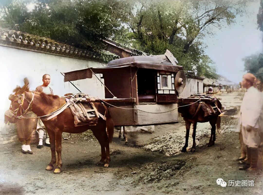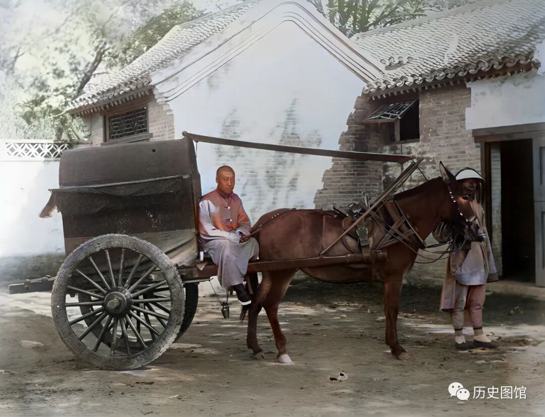 一名官员出行前,官差和车夫已经将马车准备好。这种马车带有凉棚,能够遮风挡雨。从照片的背景看,应该是拍摄于一个衙门的马厩前。马车是当时主要的交通工具。