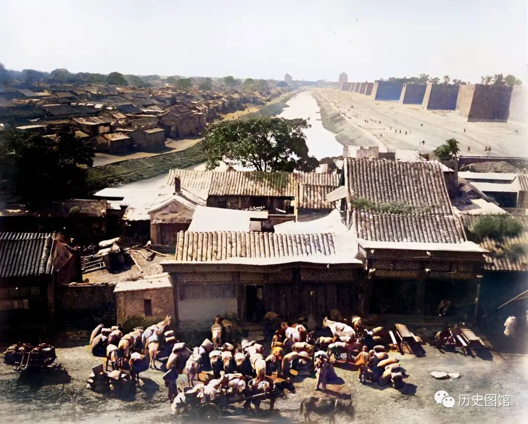 从这个角度看京城,景象令人震撼。在骡马店的后面,是北京的护城河,高大的城墙清晰可见,城外有数不清的民房,鳞次栉比,一眼望不到边。照片拍摄于1890年。