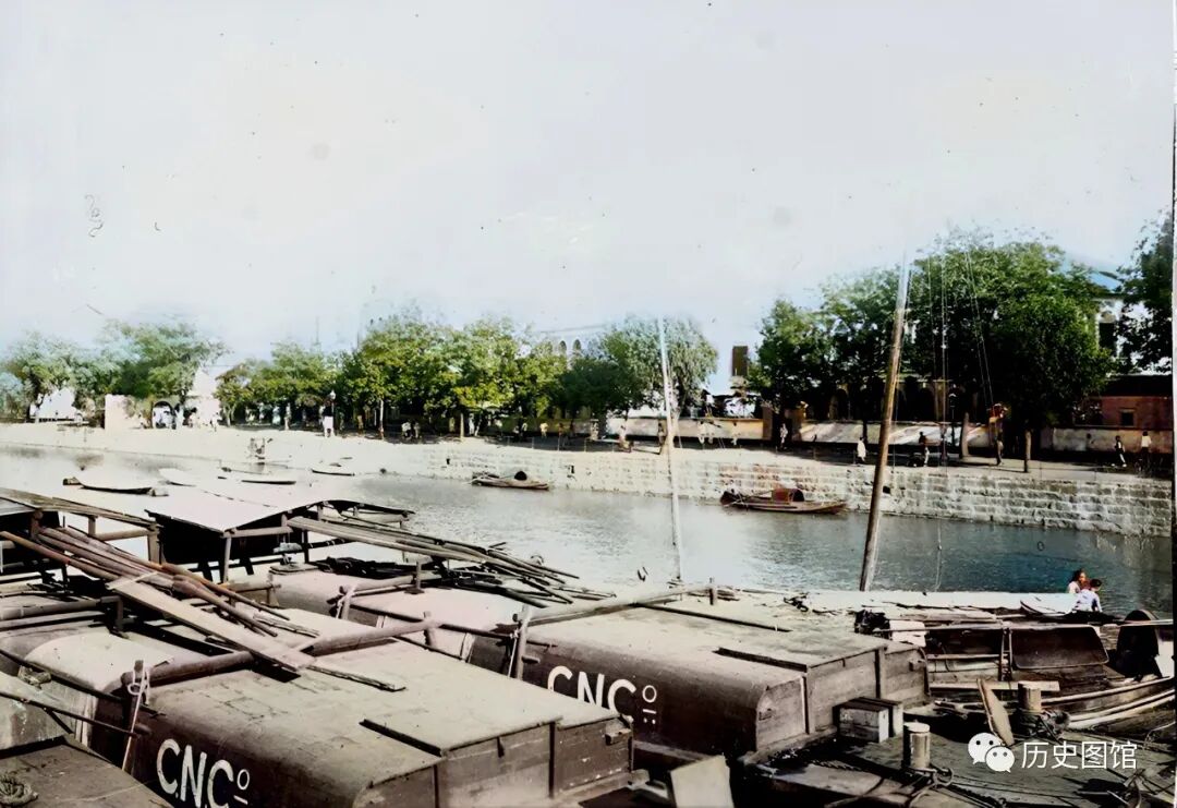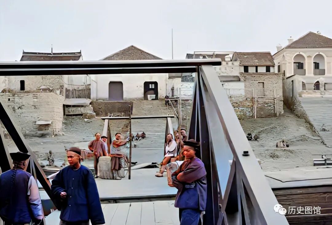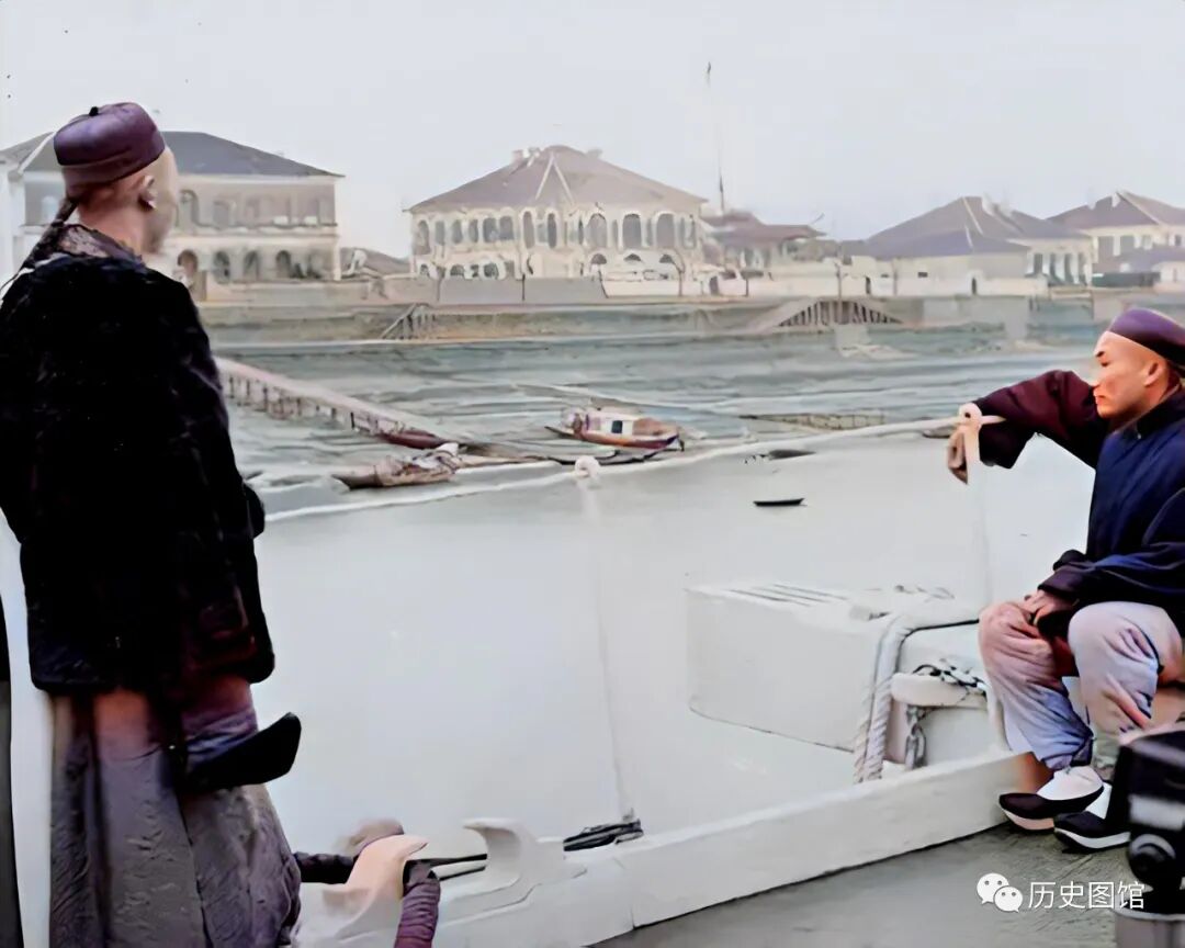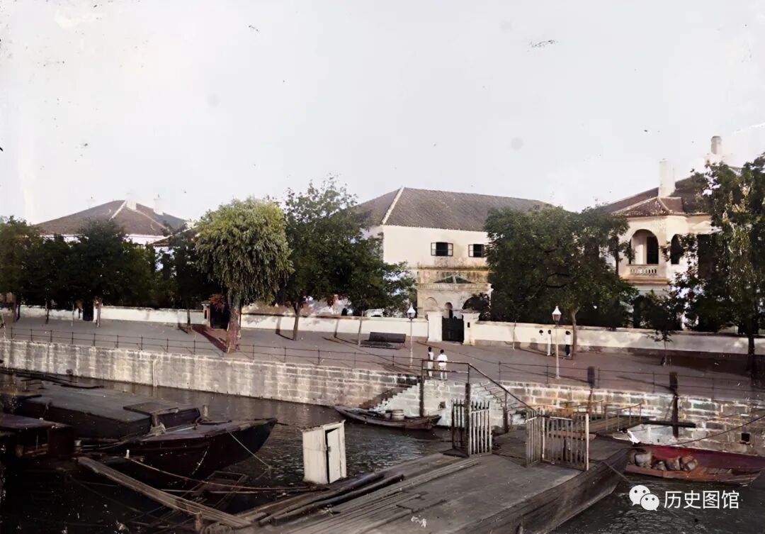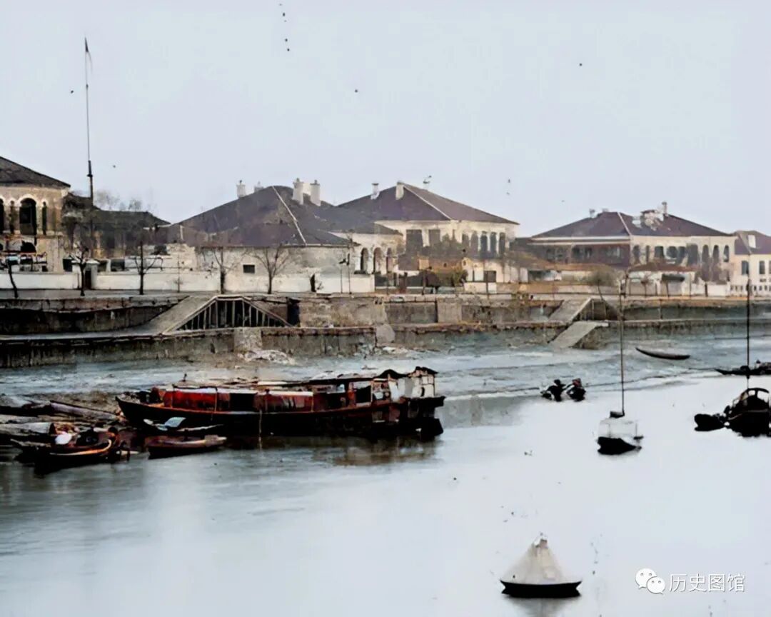 河对岸的西式建筑,是在租界被划定后,英国人强拆居民房屋基础上修建的。主要建筑有英国领事馆、日本领事馆、英国巡捕房、法庭、工部房、法国天主堂及天主堂医院等。