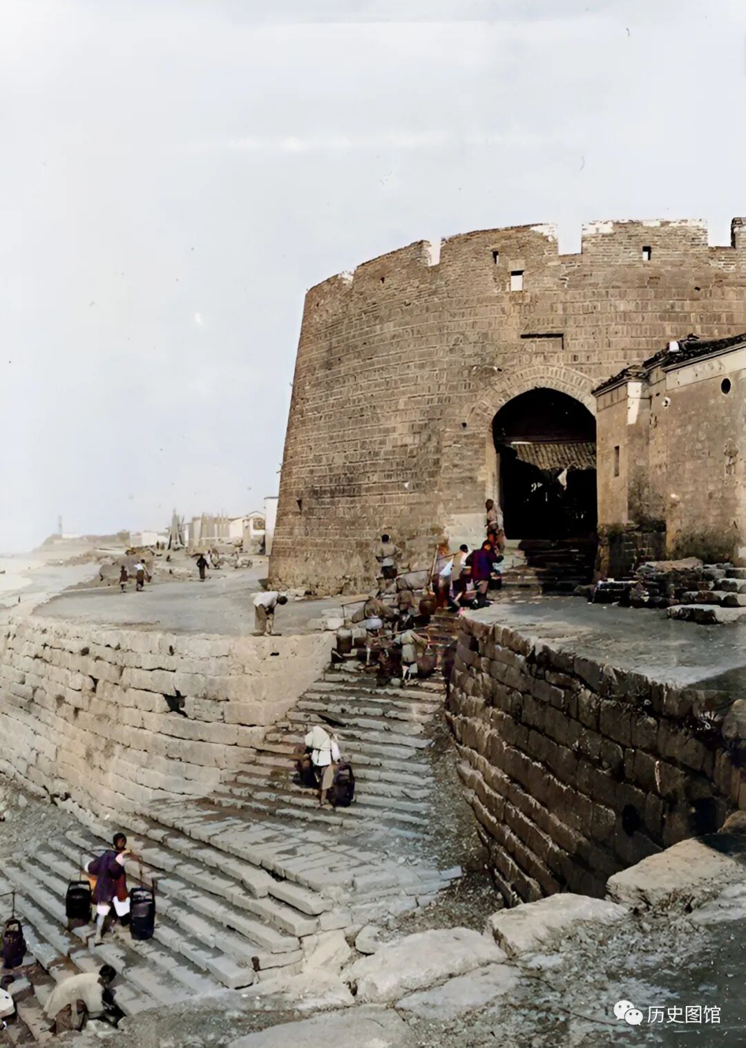 这也是九江的一座重要城门,叫岳师门。该城门濒临长江,当地百姓称之为“钥匙门”。城门前修建有台阶,可以下到到江底。人们正从江中取水,经过岳师门进入城中。