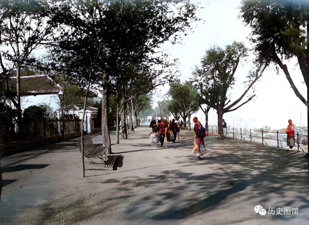 1898年,九江外滩景象。江堤上是一条宽敞笔直的大马路,两旁种植有行道树,一些西式建筑掩映其间,一行人在江堤上散步。