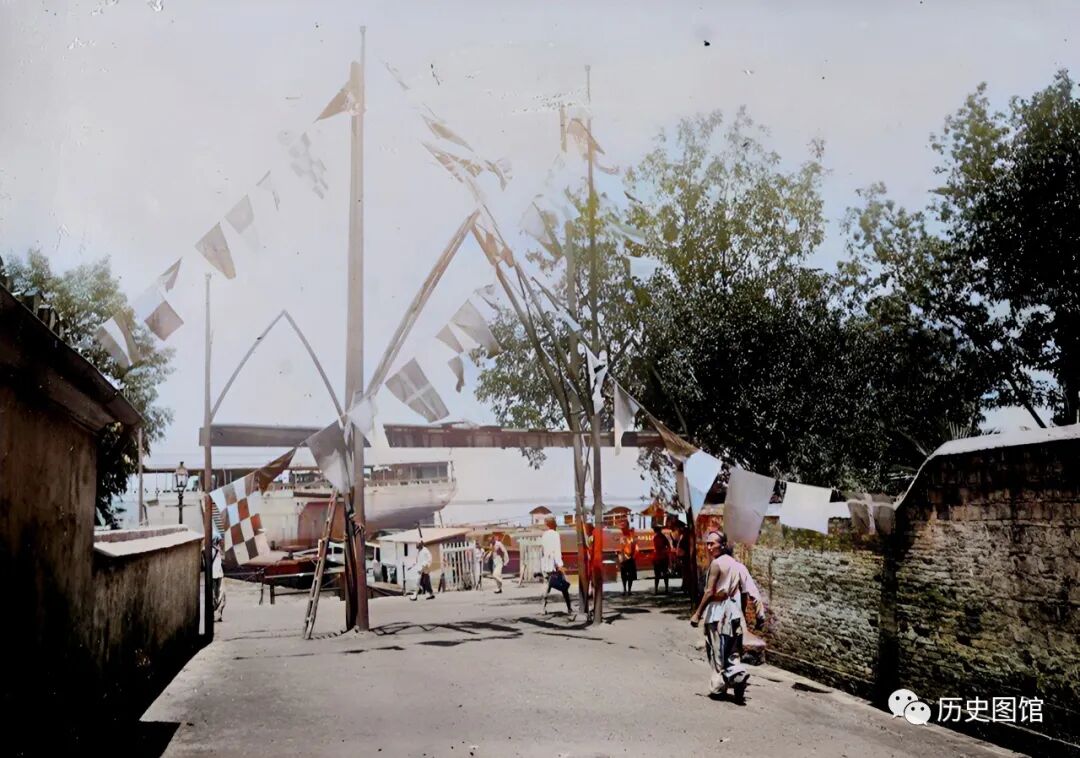 几艘货船正停靠在码头边上,工人们将货物从船上卸下来。码头上是英国领事馆所在地,馆舍建筑掩映在绿荫之中。江岸上有一些人在走动,远处,还能看到一座山。