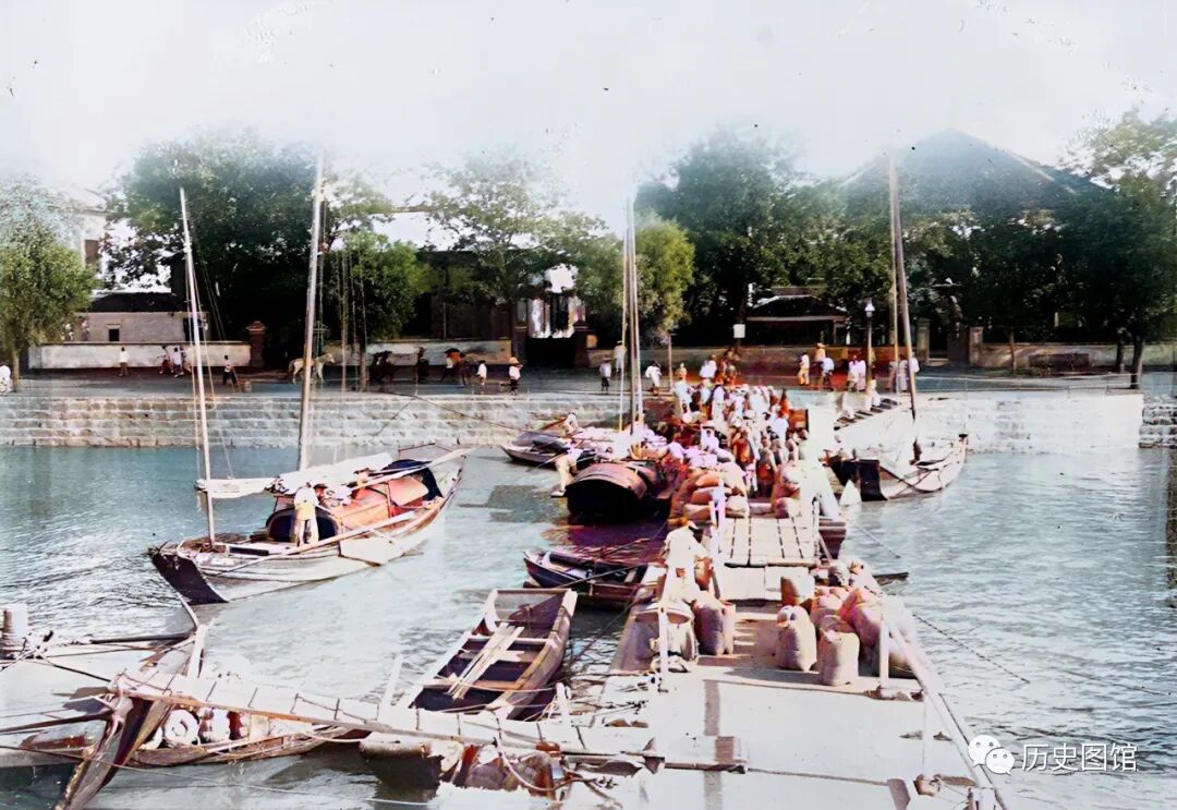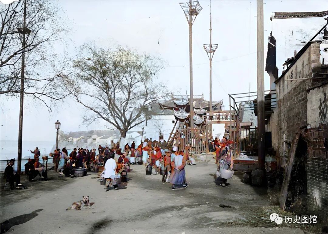 这张照片拍摄于江边,远处矗立着一座牌坊,那里就是九江钞关所在位置。门前有一些摆摊的小贩,人群熙熙攘攘。