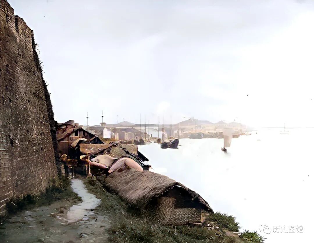 这张照片,拍摄于九江城墙之下。长江岸边排列着一些低矮的简易草房,里面住的都是“疍民”。