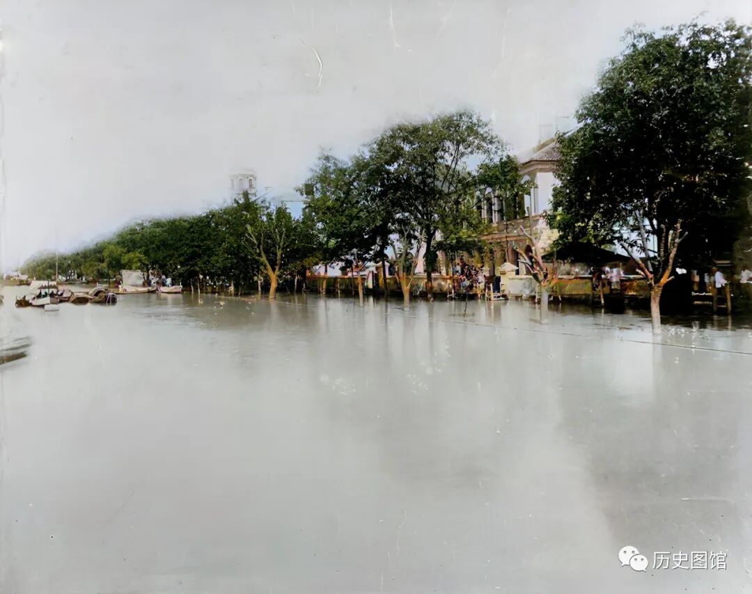 1898年,长江发生大洪水,位于长江南岸的九江自然难以幸免,成为了一片泽国。街道上到处是水,两侧的建筑和树木也浸泡在水中,人们出行只能驾驶小船。