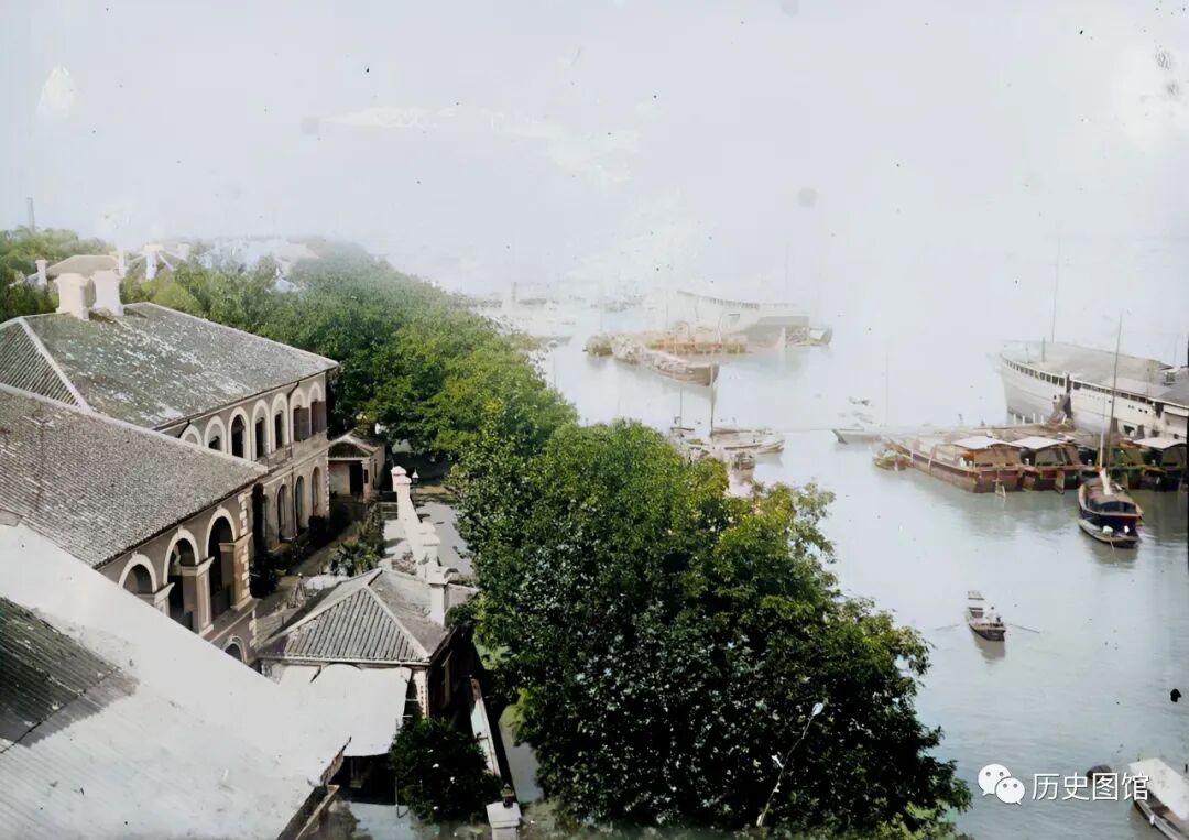 这是从高处俯瞰九江外滩景象。从这个角度,能看到的江面更多了。大船和小船在江面上来往穿梭。足见120多年前的九江,航运业何等的发达。
