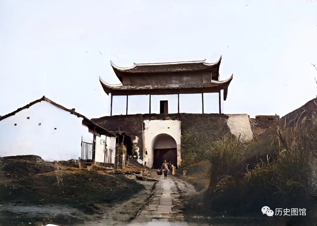 这是九江城其中一座城门。城楼高耸,城墙高大。城门前是一条很窄的小路,路面上铺着石板。一名当地人挑着担子,从城门里走出来。小路一侧建有民居,粉墙黛瓦。小路另一侧,长满了杂草。