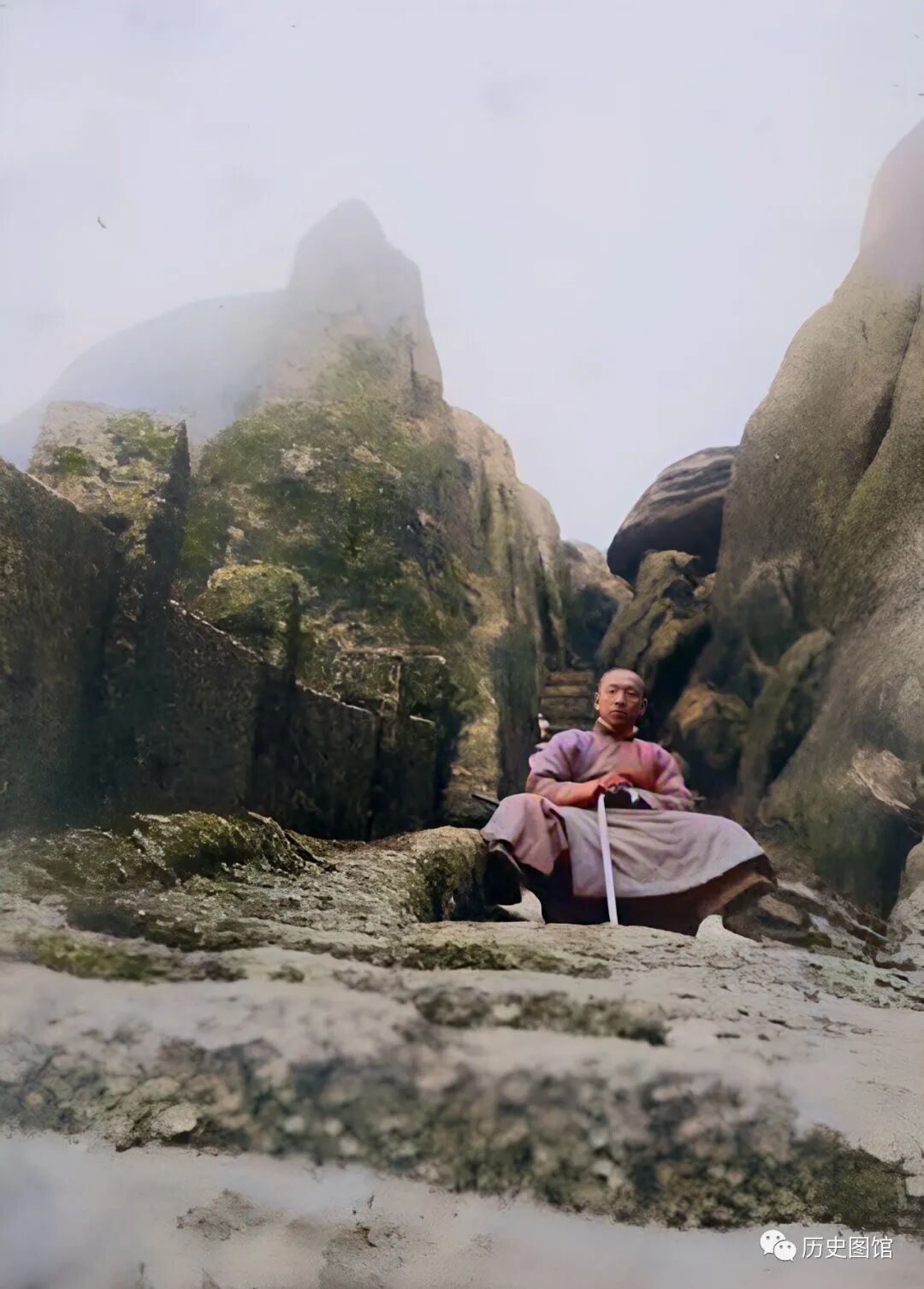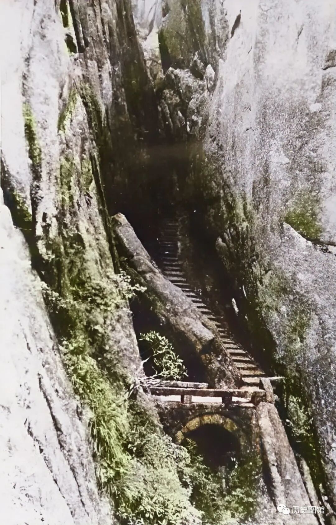 30年代,在黄山的一条山路上,一名僧人正坐在石头上休息。这是一条在岩石上开凿出来的古道。常年的行走,路面上留下了深浅不一的脚印。