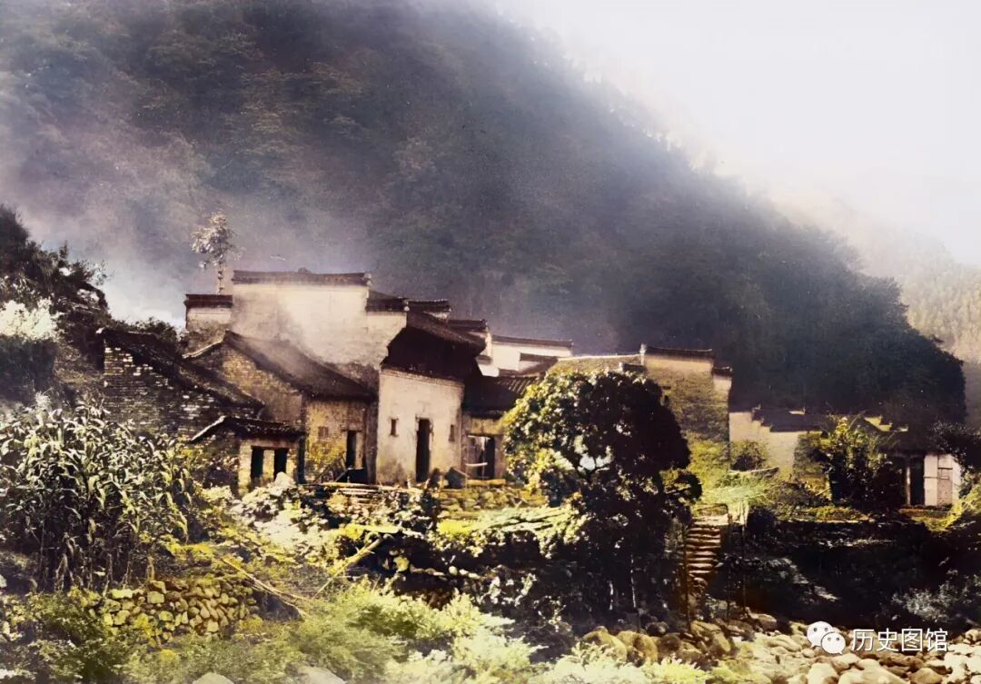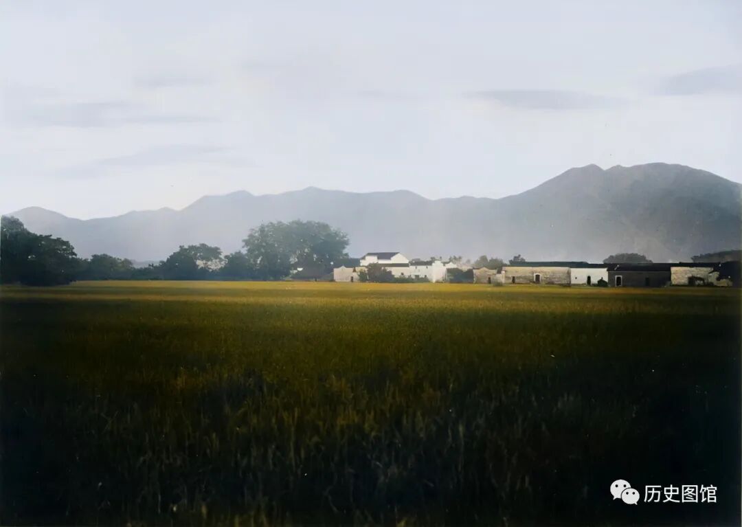 这是30年代黄山脚下的一个村落。照片拍摄于早晨,近处是一望无际的青绿色的稻田;远处有连绵不绝的山峦和粉墙黛瓦的民房,给人以十分恬静的田园气息。