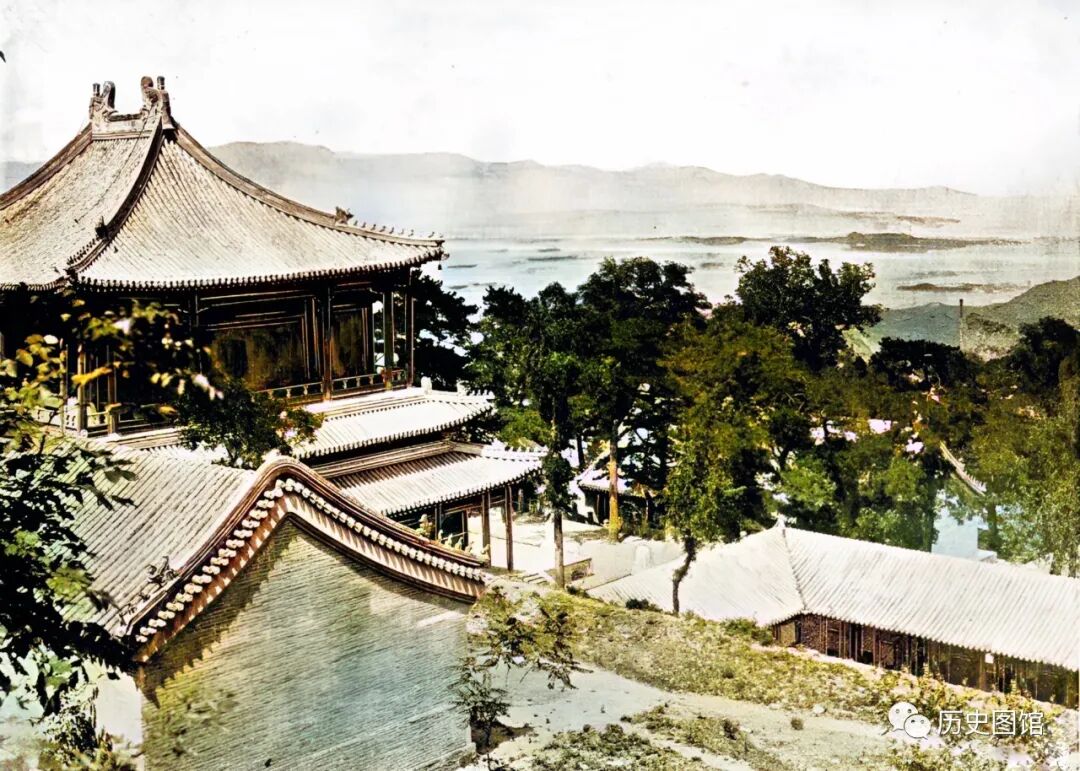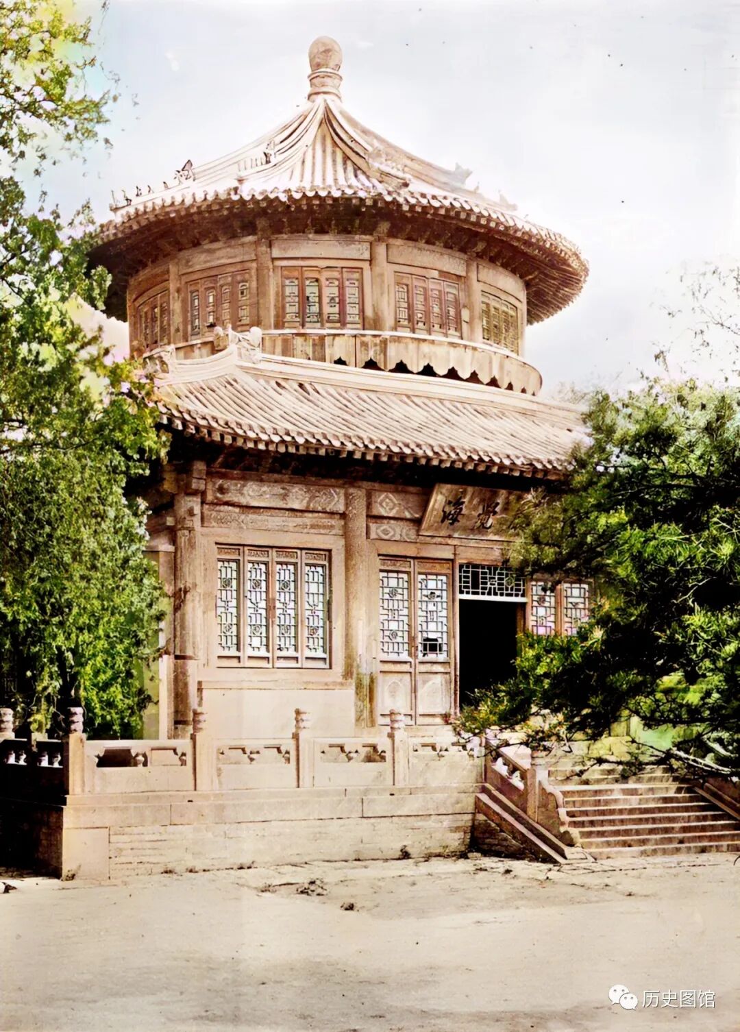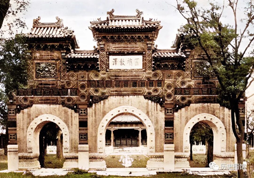 1906年,北京黑龙潭龙王庙景象。龙王庙又叫神龙祠,始建于万历十四年(1586年)。龙王庙建筑群形制很高,所有建筑物均覆以高等级的黄琉璃瓦。这里是明清时期重要的祈雨场所。