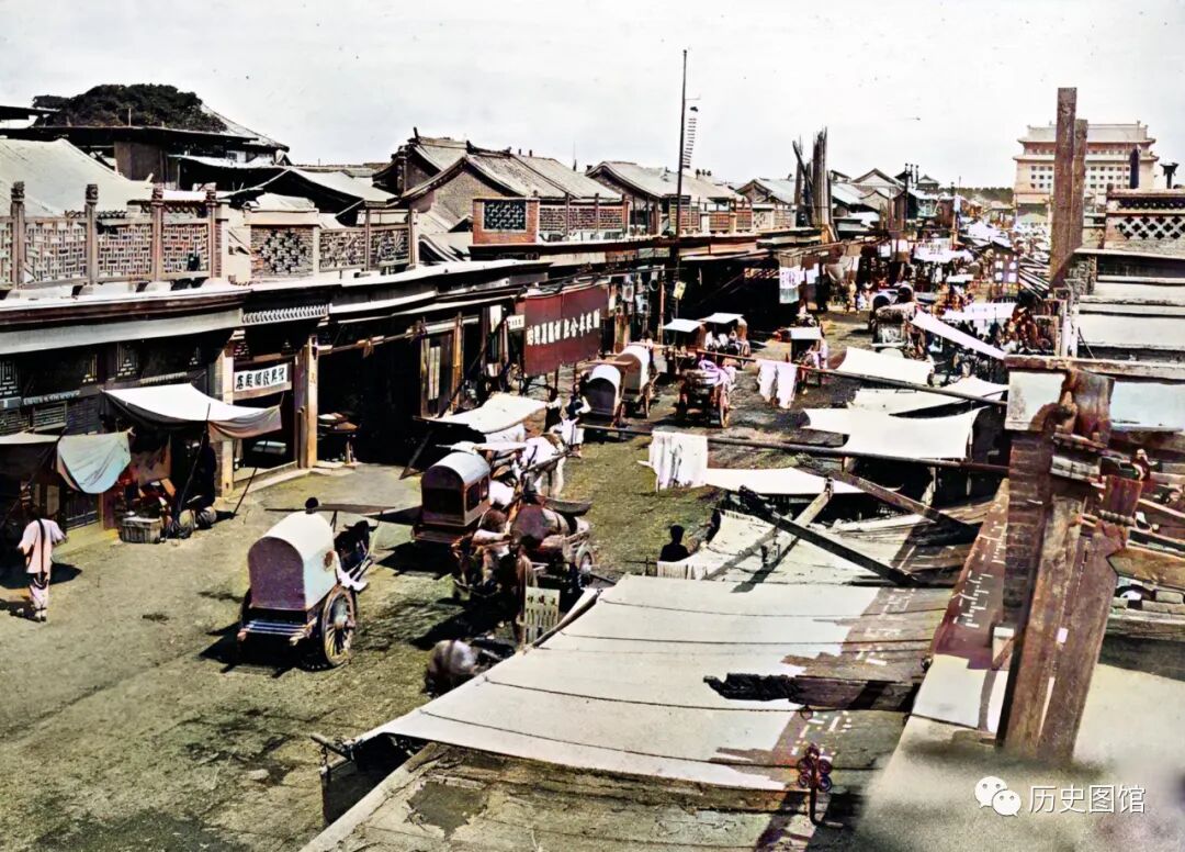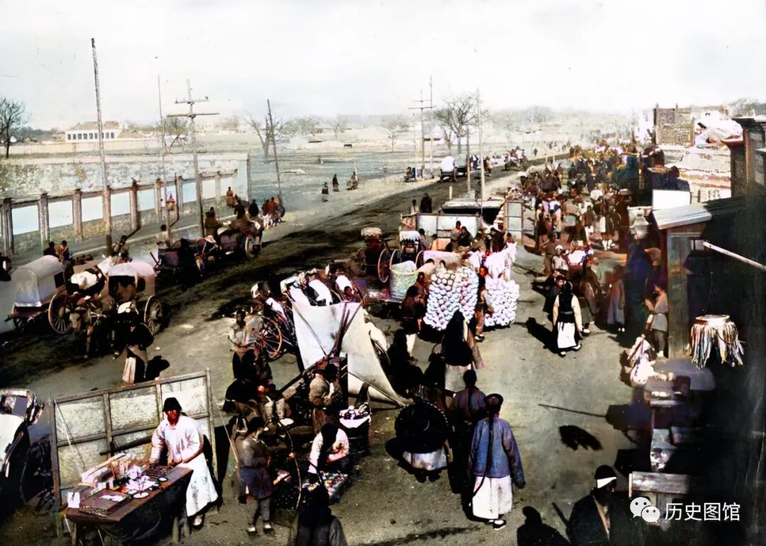1906年,崇文门大街面貌。主干道上车水马龙。路旁好像是个集市,那些摊位大多是卖小吃的。还有一些黄包车师傅,正坐在车上等待载客,一派繁忙的景象。