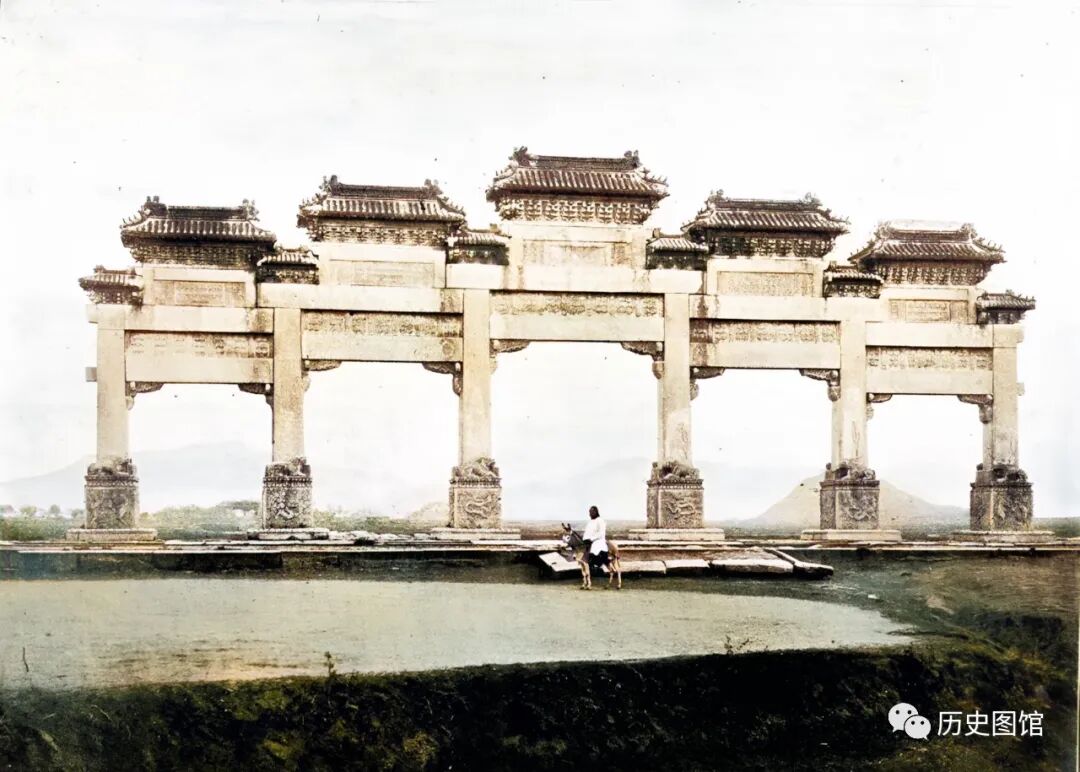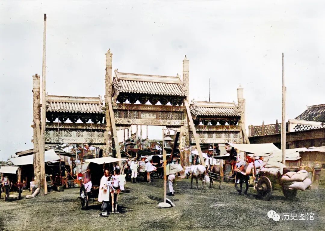 晚清时期的北京东单牌楼,东单因为街口的牌楼而得名,照片中矗立着一座三间四柱三楼冲天式木牌楼,始建于明永乐年间。东单牌楼前,车水马龙。两侧是沿街店铺。