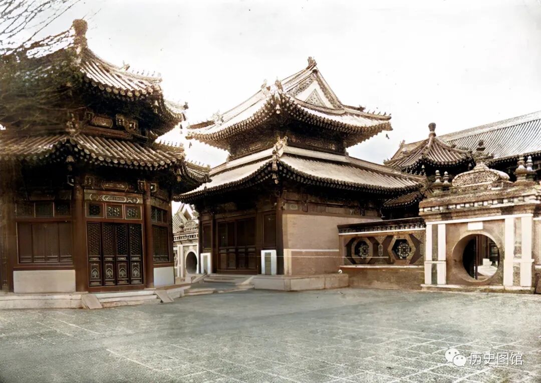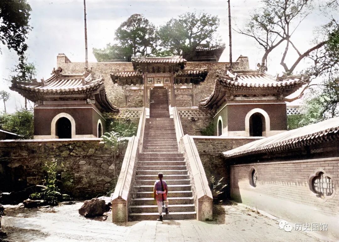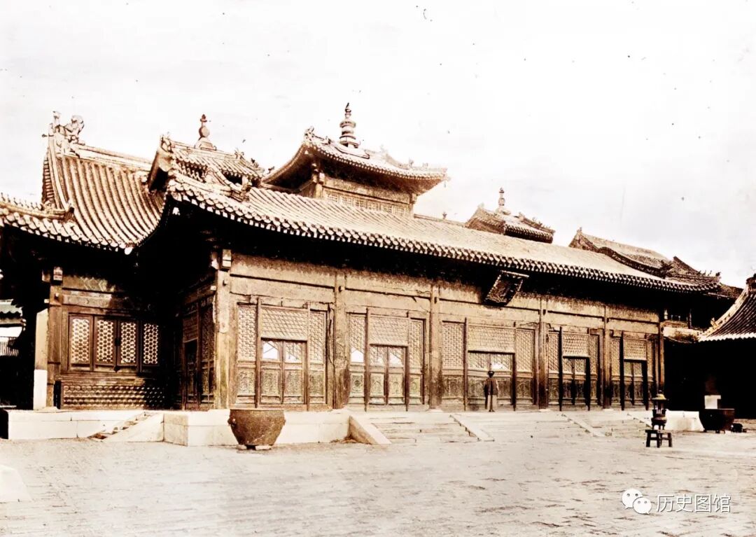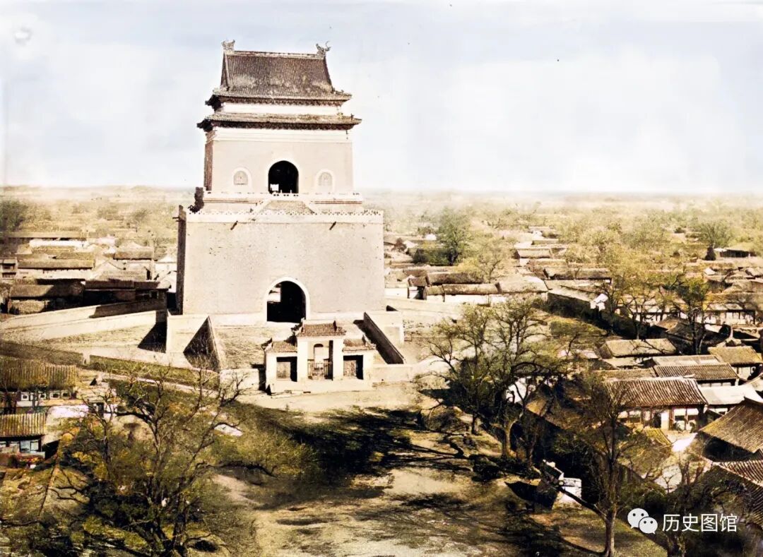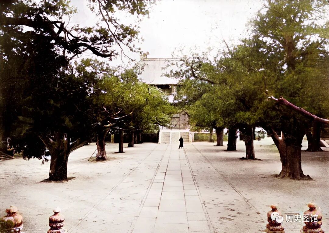 这是当时的北京大钟寺。大钟寺原名觉生寺,始建于清雍正十一年(1733年)。寺庙规模宏大,是清代雍正皇帝下令建造。原是皇帝祈雨和信徒朝圣的场所。