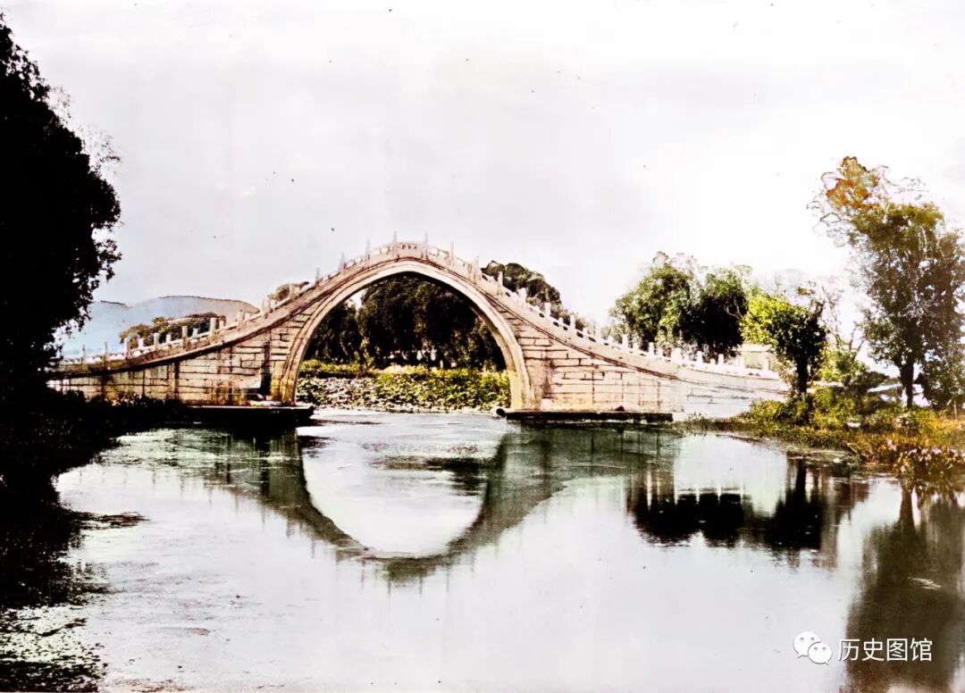 这个造型优美的拱桥,是著名的“玉带桥”。桥身用汉白玉和青白石砌成。该桥位于颐和园昆明湖长堤上,建于清乾隆年间(公元1736-1795年)。当时的拱桥,衬托着周围的环境,显得很古朴。拱桥在水中,美轮美奂。