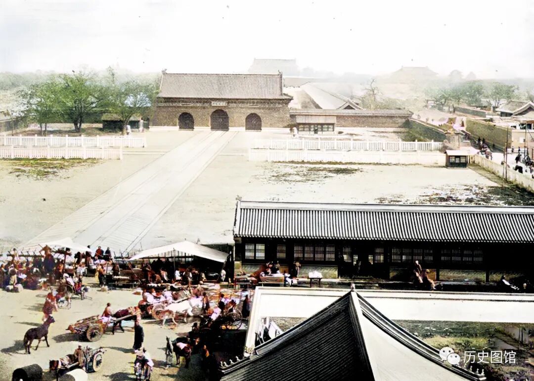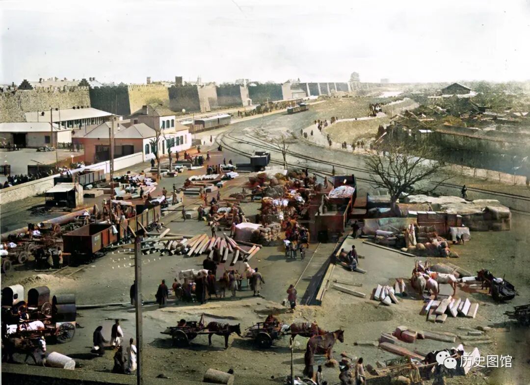 这是北京前门车站。站前广场上,停放着各种各样的货物,还有一些马车在等待拉货。前门车站,即京奉铁路正阳门东站,始建于光绪二十七年(1901年),为当时国内最大的火车站。