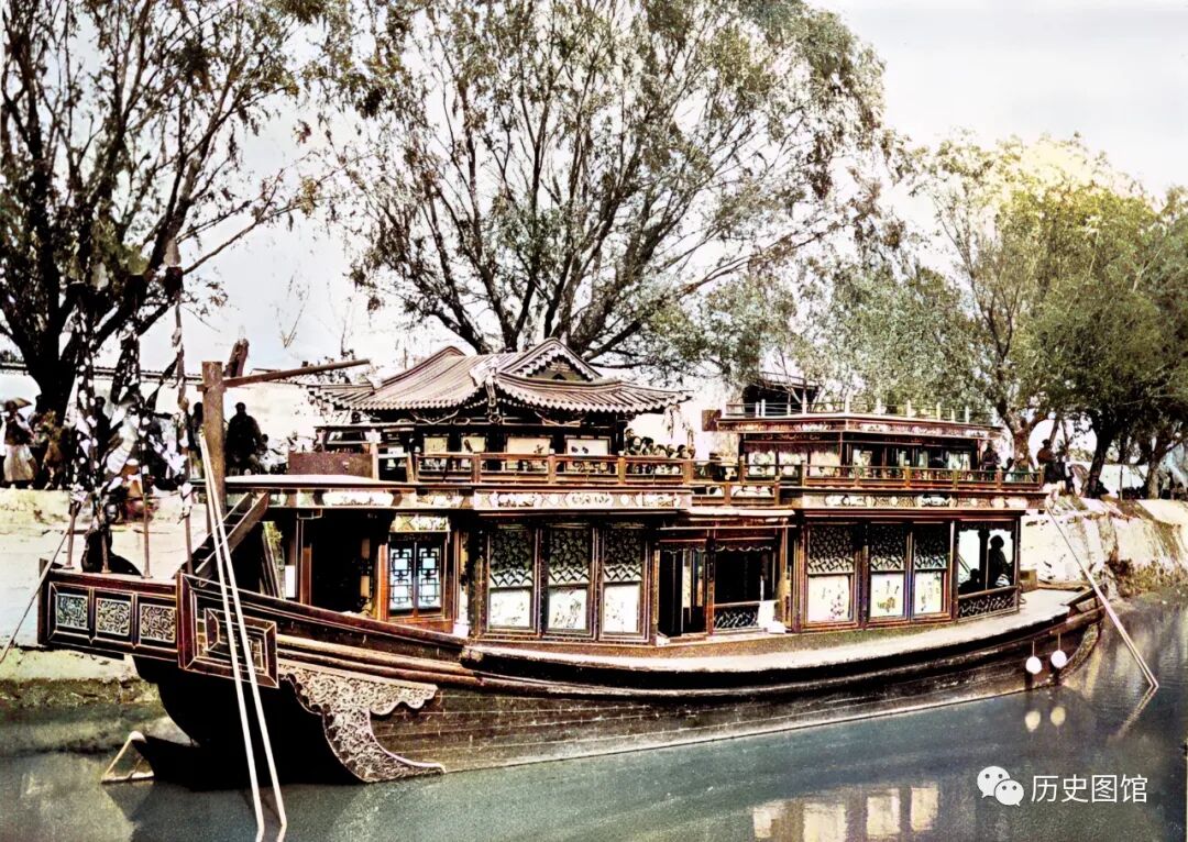 这是停靠在颐和园里的一艘皇上宝座船。船上建有楼阁,二层有观景平台,宝船雕梁画栋,处处透着皇家贵气。