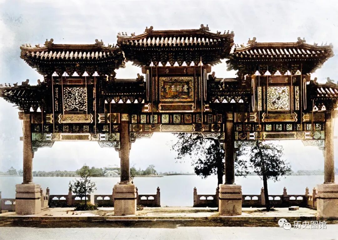 万寿山前紧靠昆明湖的“云晖玉宇”牌楼。南面的匾额上写着"星拱瑶枢”。该牌楼为三间四柱七楼,绘金龙和玺彩画,等级极其高贵。从这个角度望去,远处的昆明湖烟波浩渺,一眼望不到尽头。