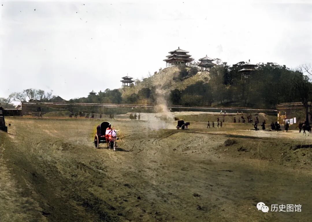 远处这座小山,是1906年的北京景山。景山位于北京城的中央,是穿越紫禁城纵贯全城中轴线的制高点。景山公园的五座亭子自东向西,分别是分别是:周赏亭、观妙亭、万春亭、辑芳亭、富览亭。它们建于乾隆年前,已经有了将近270年的历史。