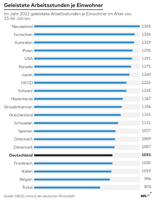 布莱恩特在文中质疑德国未能充分发挥其劳动潜力,尤其是女性和接近退休年龄的群体。他依据的研究数据显示,与其他OECD国家相比,德国的工作时长确实处于较低水平。尽管布莱恩特也承认,各国在收集这些数据时可能存在方法上的差异。