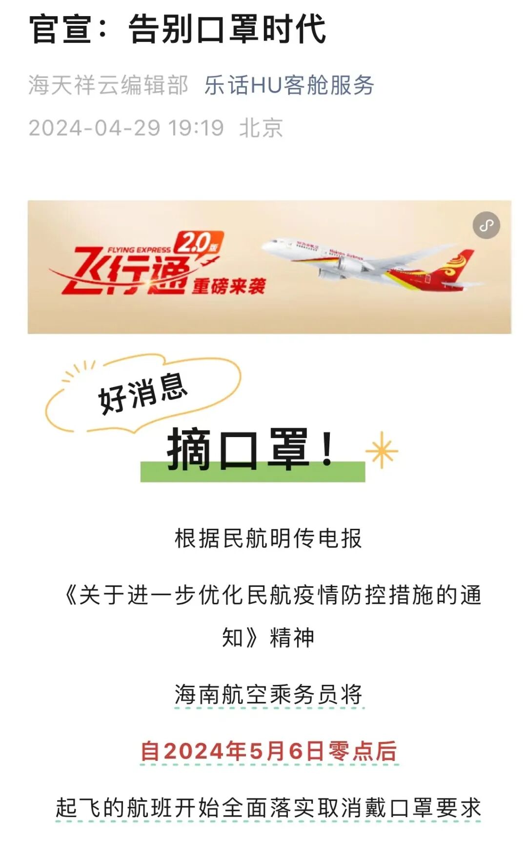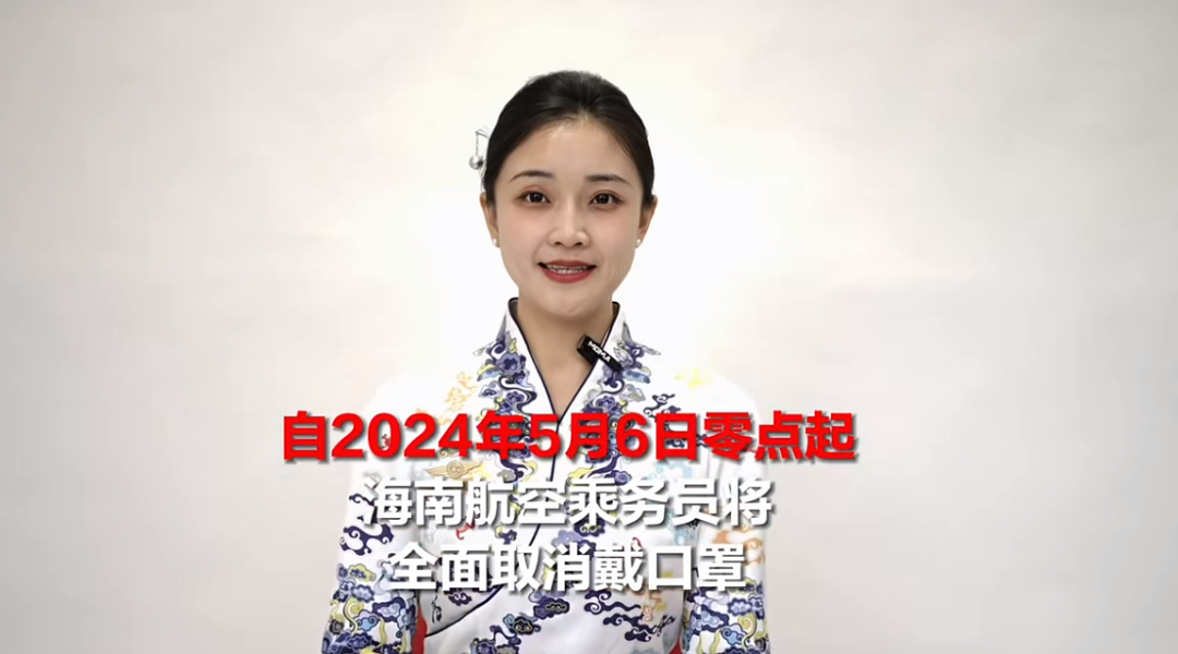 根据民航明传电报《关于进一步优化⺠航疫情防控措施的通知》,海南航空乘务员将自2024年5月6日零点后起飞的航班开始全面落实取消戴口罩要求: